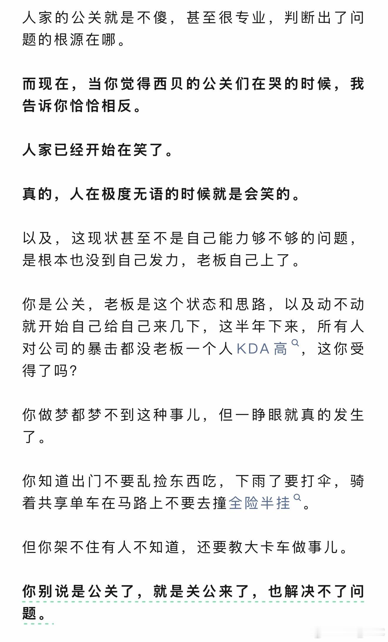 影视飓风也开始招专业公关了,应对舆情风控确实得专业人做专业事,反面案例就是西贝的贾国龙。公关不是诡辩,而是一门正儿八经的学科。前段时间Tim遭遇了一系列舆论危机,从洋垃圾、相亲再到羽绒服,每一件都有可能打乱团队正常运营。影视飓风的应对,严格来说并不完美,比较幸运的是,他们每次都在陷入自证陷阱前及时自救。人在面对质疑时,反驳是人性,反思是反人性。最好的公关不是把舆论关进笼子里,而是及时堵住想要自证的老板的嘴。