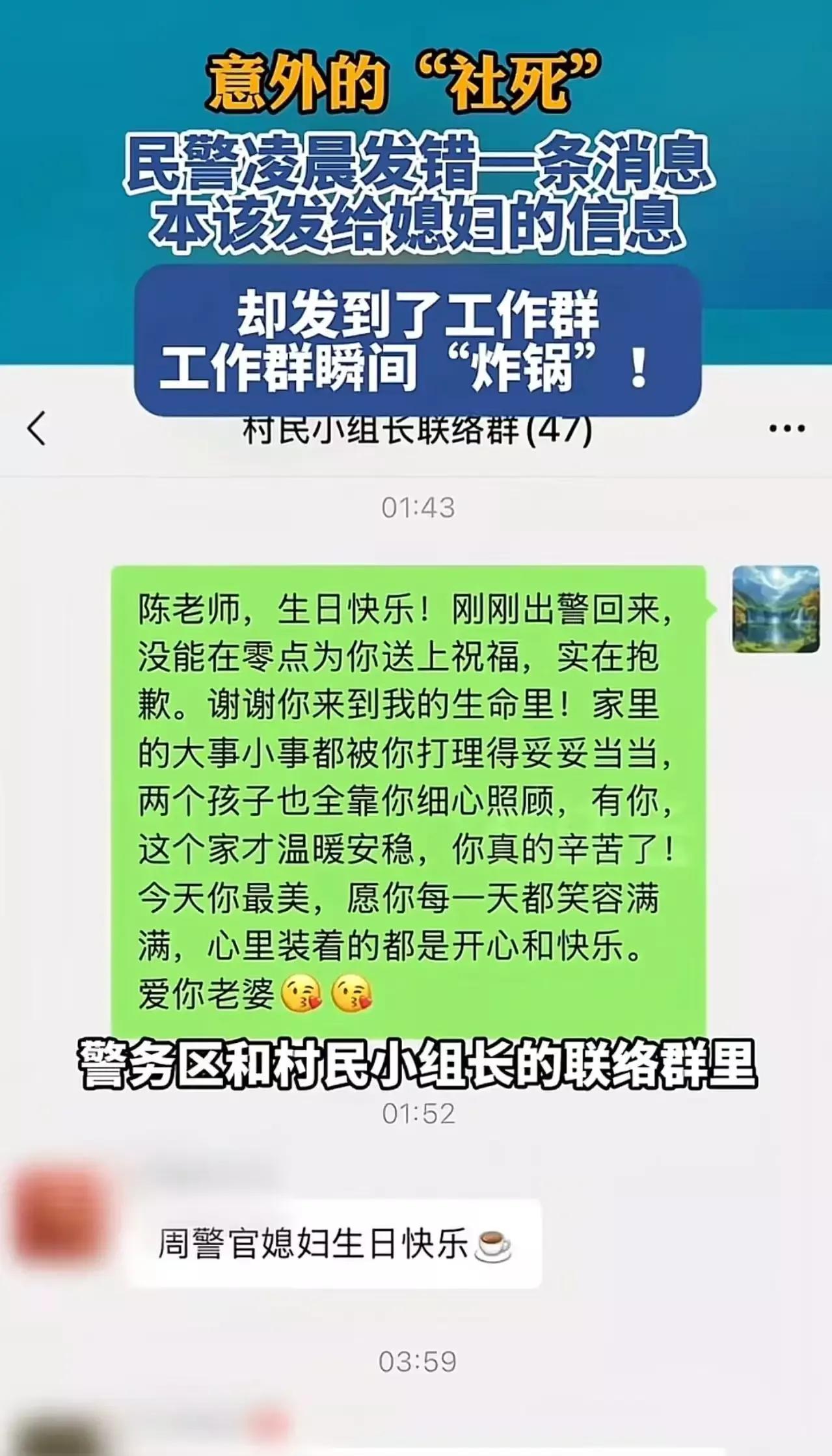 意外的“社死”!凌晨,民警给老婆发消息,却不小心发错到工作群,工作群瞬间“炸锅”! 意外的“社死”!凌晨,民警给老婆发消息,却不小心发错到工作群,工作群瞬间“炸锅”!原本只是一个温馨的“早安”问候,没想到却变成了全体同事的“笑料”。这场“误会”不仅让他颜面尽失,更让人看到了职场中那些令人哭笑不得的尴尬瞬间。 事情的起因很简单:那天晚上,他忙完一天的工作,想着给老婆发个早安提醒,顺便聊聊家里的琐事。谁知一时疏忽,把私人的微信消息发到了工作群里,内容还带着点“私密”色彩——“老婆今天特别辛苦,要我多关心她。”还没等他反应过来,屏幕上就开始“炸锅”。 “这是谁啊?”“怎么发到这里来了?”“这是私人聊天吗?”“别误会啊,这是我老婆的事。”各种评论像雨点一样砸了过来。有的同事还调侃:“警察同志,私生活也要注意点啊,别把工作变成家庭聊天室。”更有调皮的,有的直接截图转发,笑料不断。 这场“意外”让他深刻体会到:在这个信息泛滥、碎片化的时代,一不小心就可能“社死”。更令人感慨的是,职场中的“尴尬”不仅仅是自己丢脸,更反映出我们对“私与公”的界限还不够清晰。我们都知道,工作场合要保持专业,但在这个快节奏、压力山大的环境里,谁又能保证不会有一瞬间的“失控”呢? 这件事也让人反思:在数字时代,个人隐私和职业界限该如何把握?是不是每个人都在潜移默化中变得“无所遁形”?我们都曾有过“发错消息”的瞬间,但真正能从中吸取教训、学会保护自己的人,又有多少呢? 更重要的是,这个故事带给我们的不仅是笑料,更是一面镜子。它提醒我们:在信息的海洋中,保持一份清醒和警觉,才是最好的“自我保护”。同时,也让我们看到,无论身份多么光鲜亮丽,谁都可能在不经意间“踩雷”。 你有没有过类似的“社死”瞬间?是不是也曾在无意中“暴露”了自己最真实的一面?留言告诉我,让我们一起笑着面对这些尴尬,也学会在“失误”中成长。毕竟,人生路上,谁没有点“失误”的小插曲?关键是,我们要学会用幽默和智慧,把这些“尴尬”变成成长的养分。社死 社死瞬间