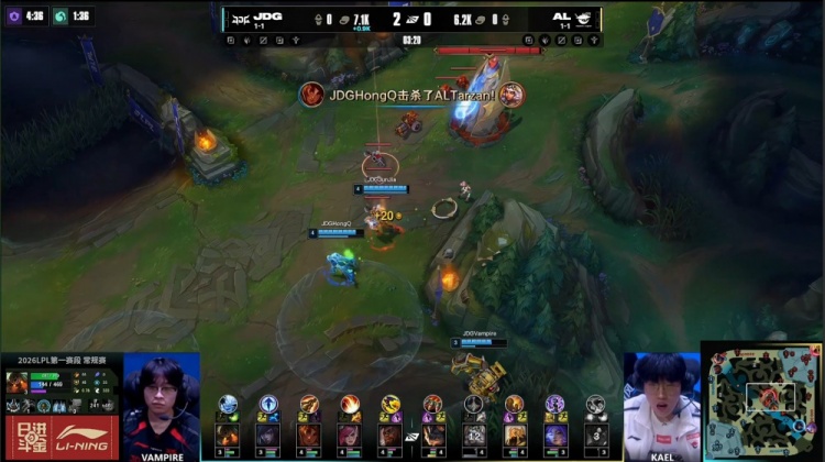 [13:01]JDG入侵AL野区,Kael牛头Q飞JDG三人,JDG中野被杀,AL打出1换2。