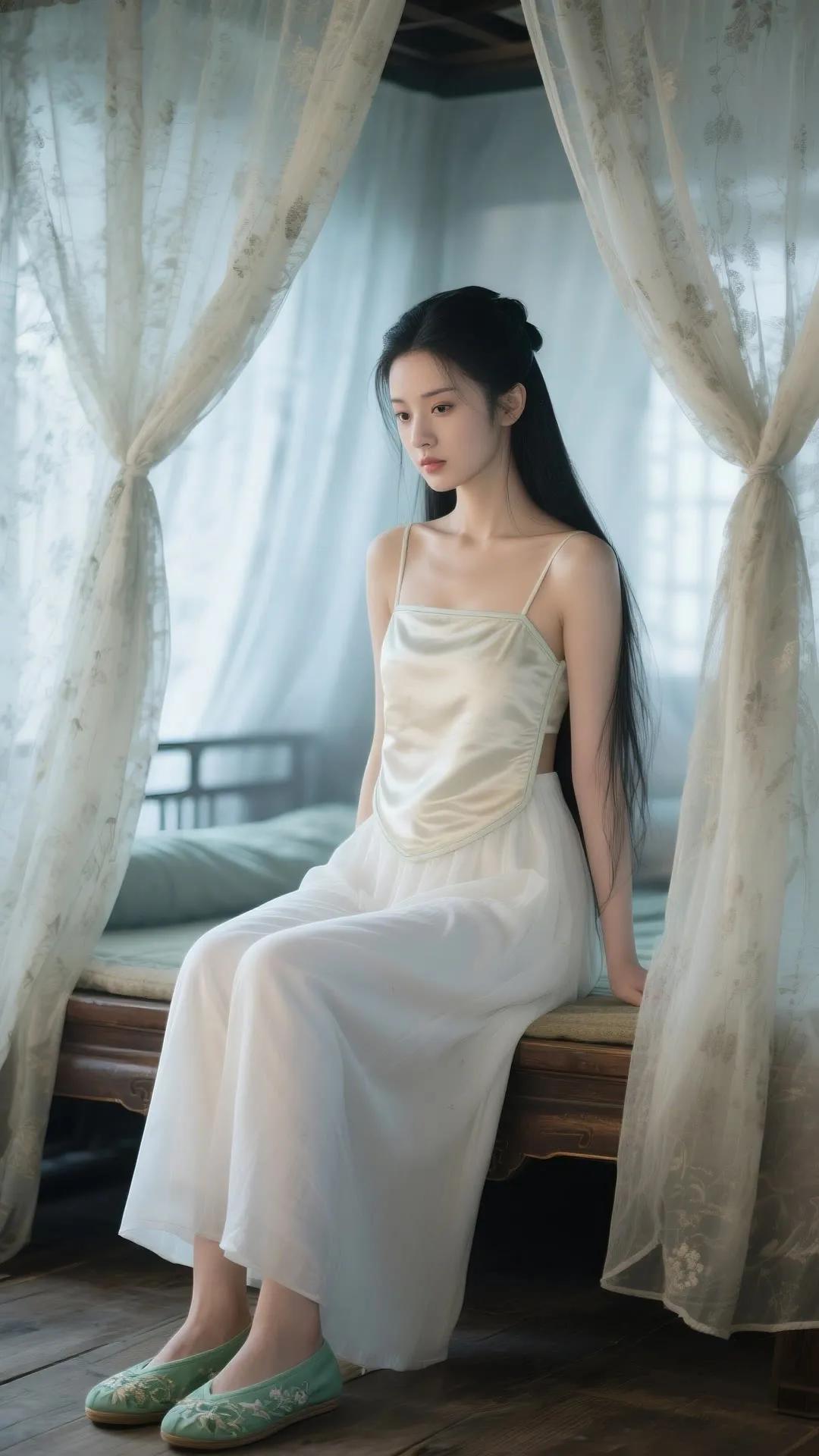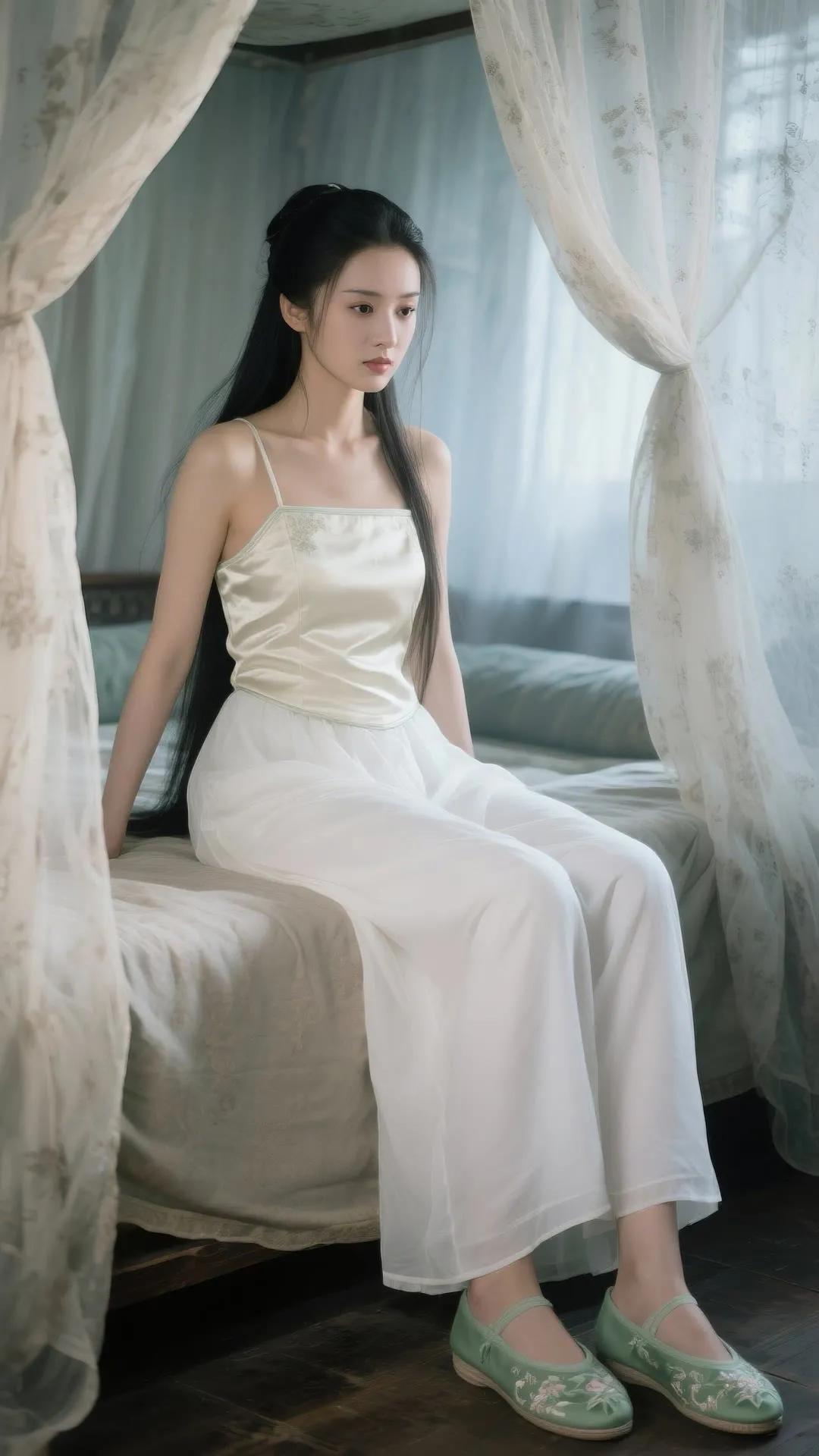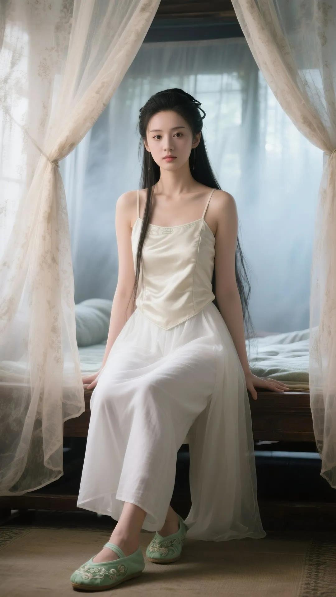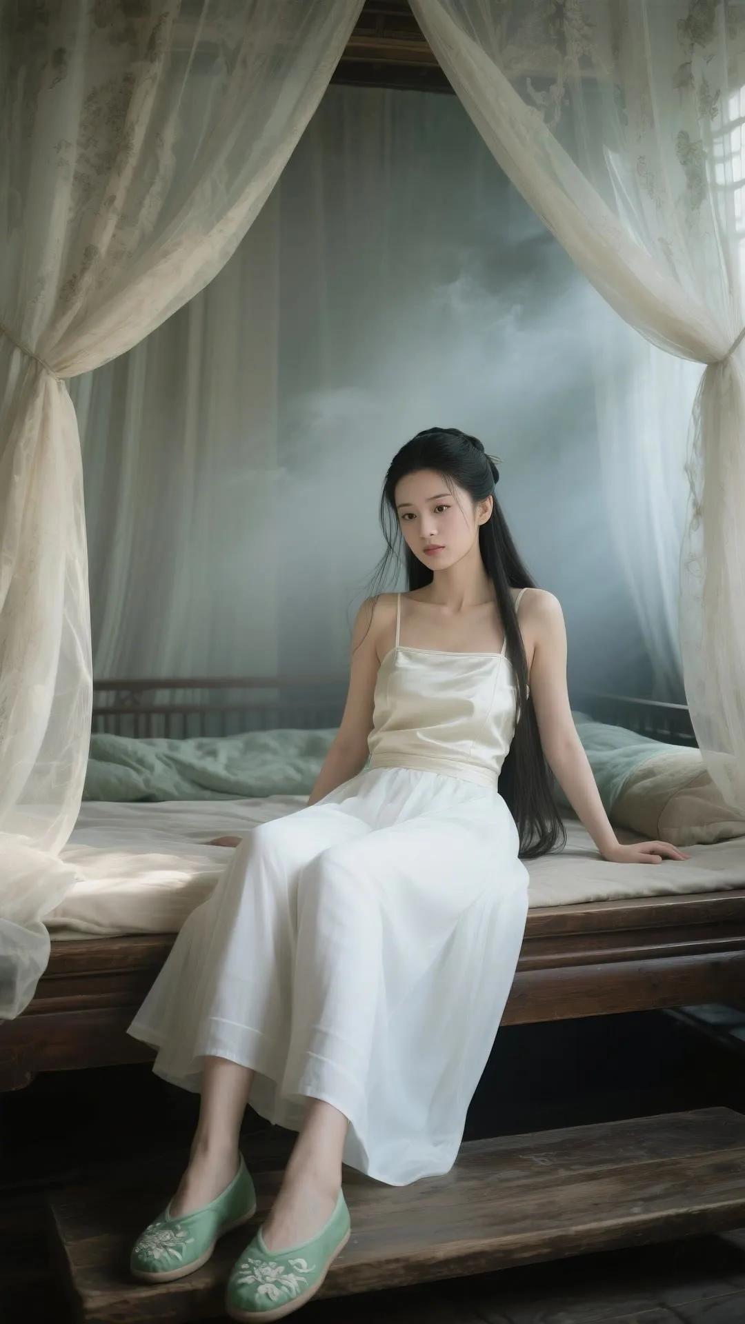古风少女,静坐床边,轻纱飘逸,梦回古代。
