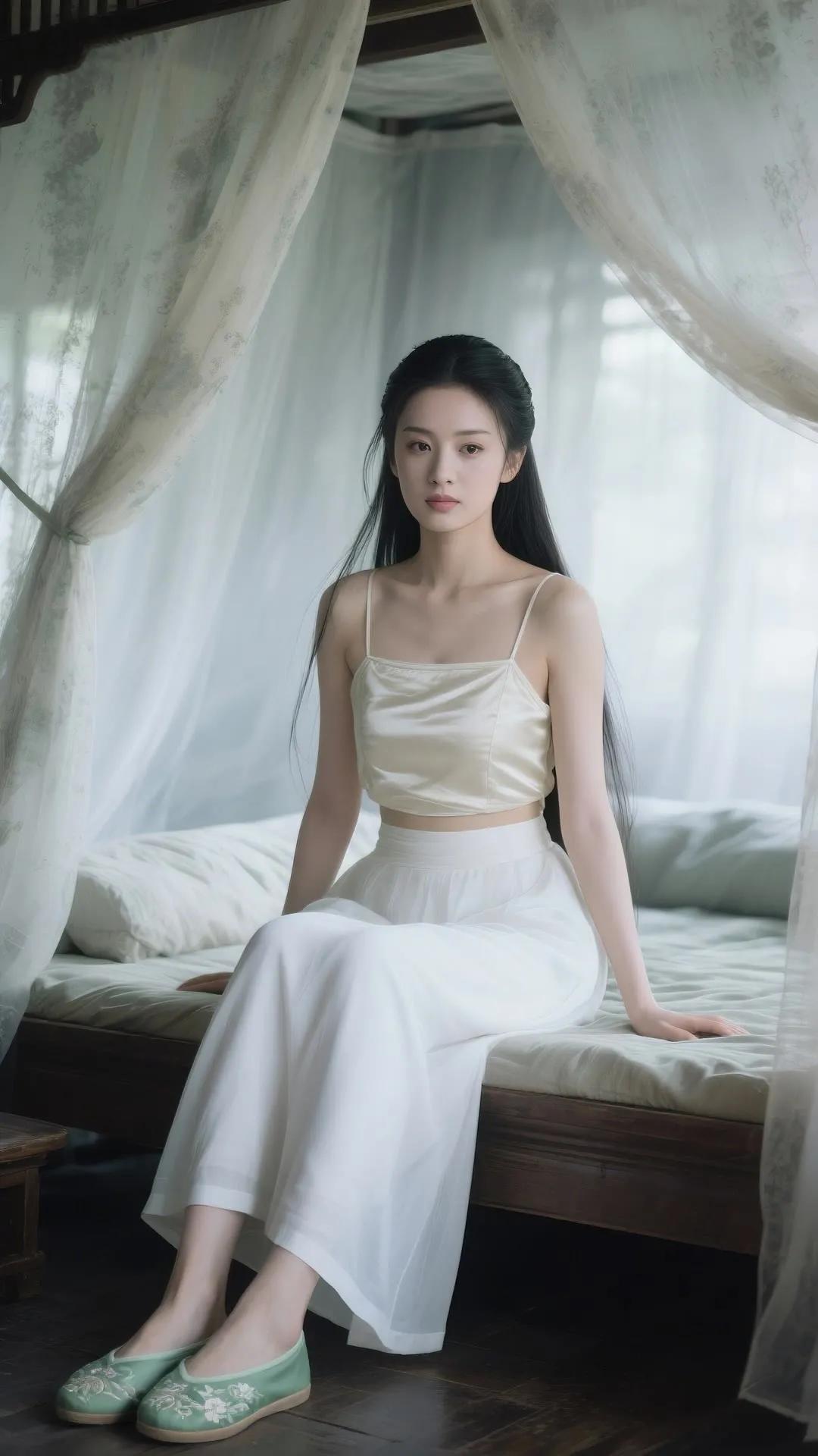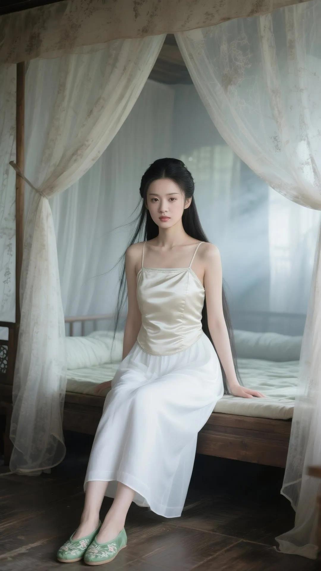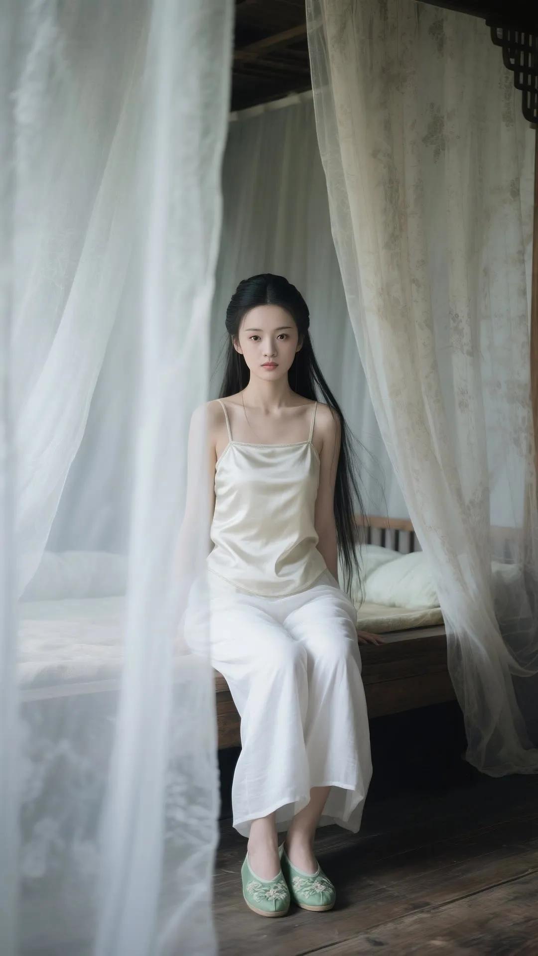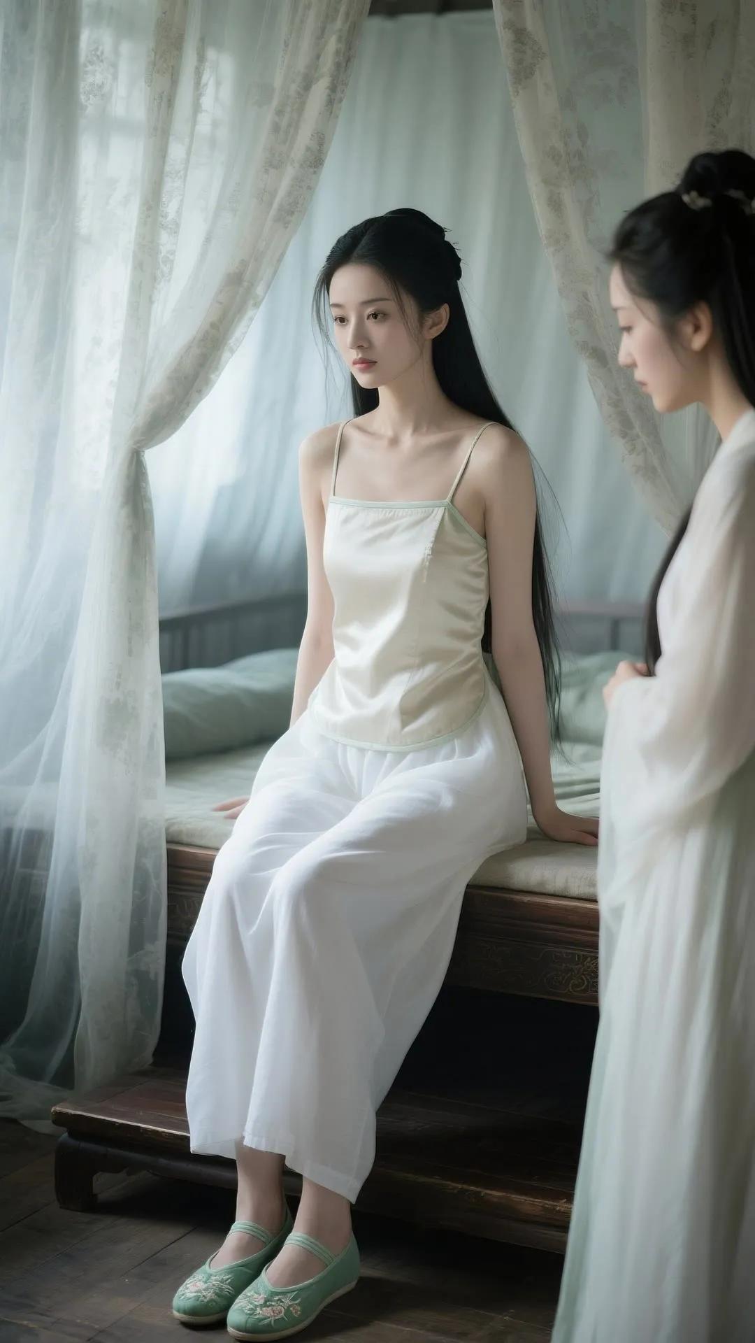 古风少女,静坐床边,轻纱飘逸,梦回古代。