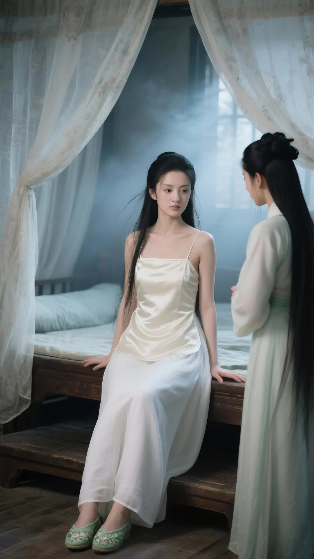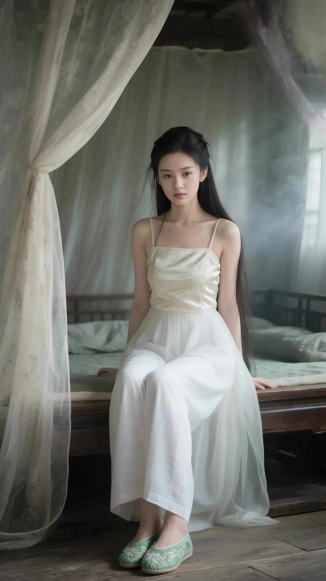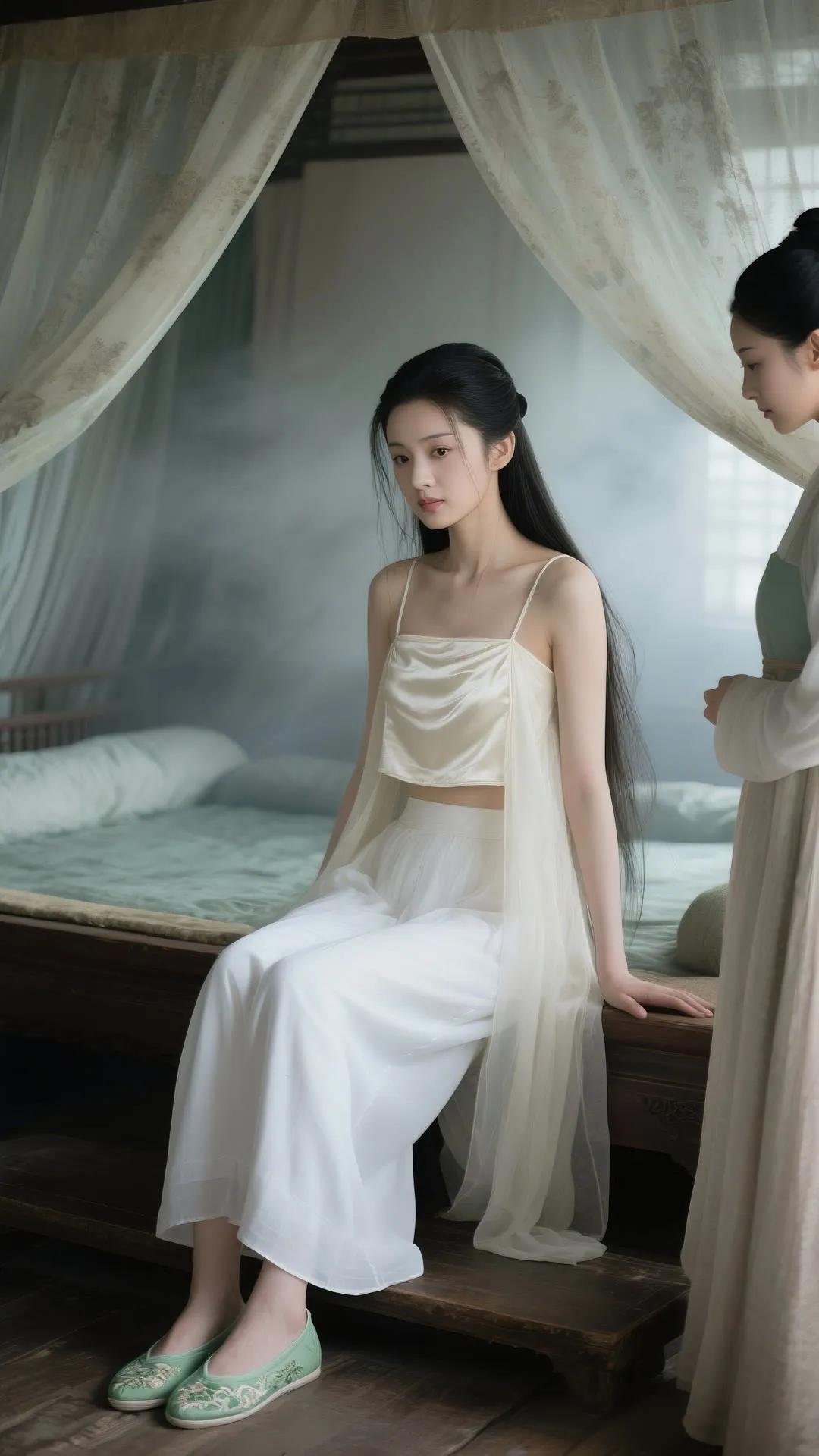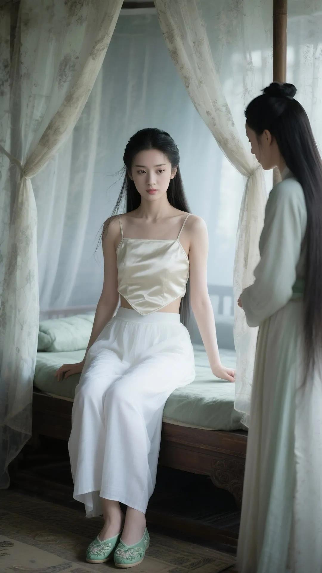 古风少女,静坐床边,轻纱飘逸,梦回古代。