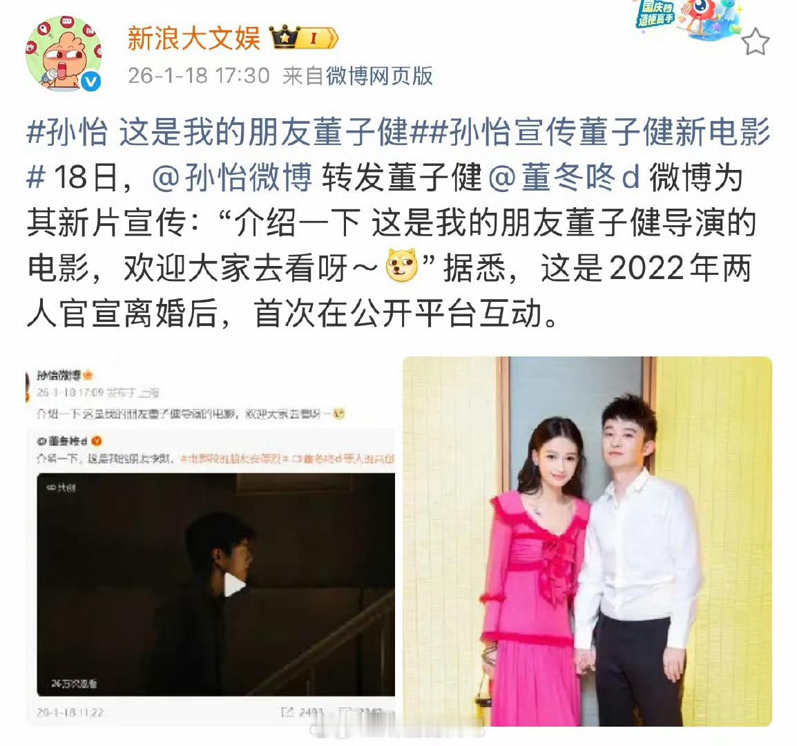 孙怡 我的朋友董子健啥意思…?虽然两人是和平分手,但离婚后孙怡换上“远离男人”的手机壳还大营销一番大家可是都没忘呢,现在这又? 很多网友都不买账,扑到前妻帮忙宣传了,也是没招了 说到底还是少立点人设叭 董子健回复孙怡