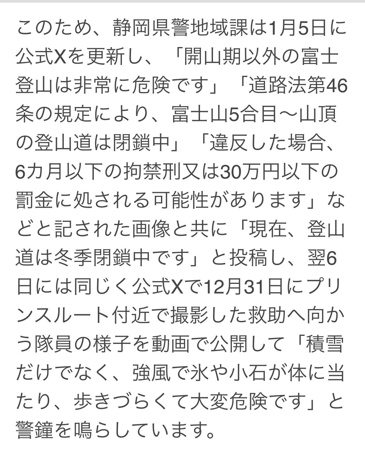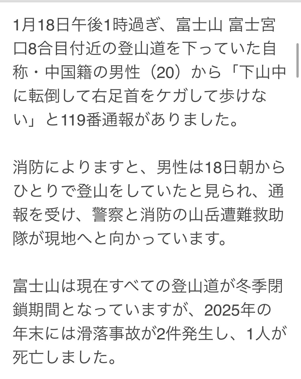 下午1点多,一名 20 岁中国男子独自在富士山富士宫 8 号合目下山途中摔倒,右脚踝受伤无法行走,随后拨打119寻求帮助。警察和山地救援队已赶往现场营救。 富士山所有登山道均关闭过冬,五合目至山顶的登山路线已关闭。违者可处以最高六个月监禁或最高30万日元罚款。但截至2025年底,发生两起坠落事故,造成一人死亡。