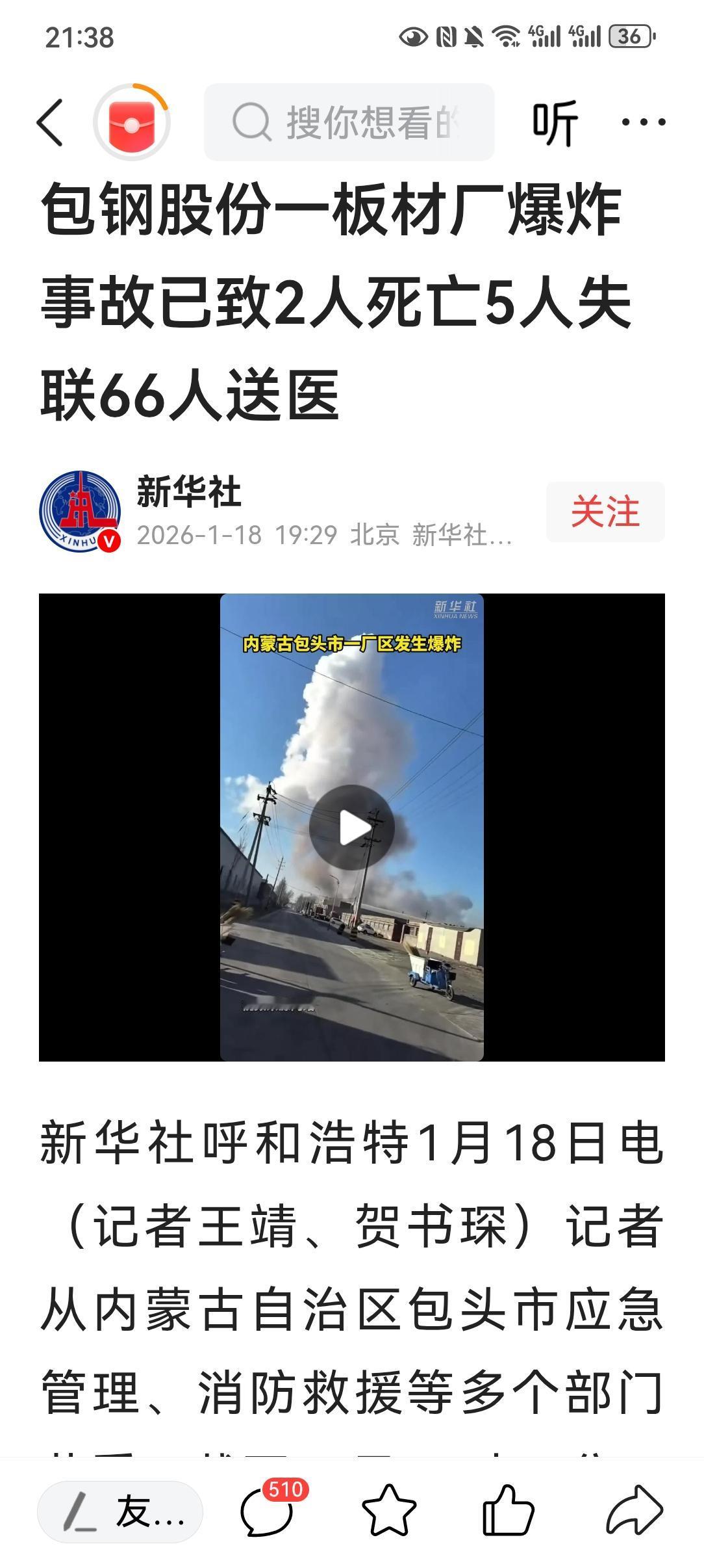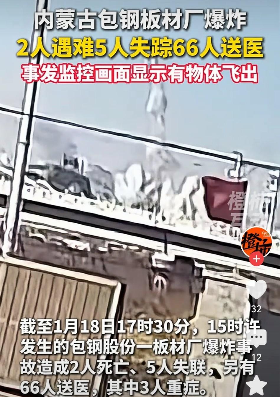 突发!包钢股份一板材厂爆炸,已致2人死亡5人失联,66人送医 今天下午,一则令人揪心的消息从内蒙古包头传来:包钢股份一板材厂发生爆炸事故,截至发稿时,已造成2人死亡、5人失联、66人送医。这起发生在1月18日的突发事故,瞬间牵动了无数人的心。 现场直击:浓烟冲天,多部门紧急救援 从现场视频可以看到,厂区上空腾起巨大的白色烟柱,在晴朗的蓝天背景下格外刺眼。 事故发生后,包头市应急管理、消防救援等多部门第一时间赶赴现场,展开紧急搜救和伤员救治工作。 目前,失联人员仍在全力搜救中,66名送医人员正在接受治疗,具体伤情有待进一步通报。 包钢股份作为内蒙古乃至全国重要的钢铁企业,其板材厂是核心生产单元之一。 此次事故不仅对企业自身生产造成冲击,更给整个钢铁行业敲响了安全警钟。 钢铁生产涉及高温、高压、易燃易爆等多重风险,任何一个环节的疏漏都可能引发严重后果。 每一起安全事故的背后,都可能存在隐患排查不到位、安全管理有漏洞的问题。这起爆炸事故再次提醒我们: 安全责任必须压实:企业要把安全生产放在首位,不能只追求效益而忽视风险。 隐患排查必须彻底:对高风险生产环节要进行常态化、全方位的隐患排查,做到早发现、早整改。 应急处置必须高效:完善应急预案,加强应急演练,确保事故发生时能第一时间响应、最大限度减少伤亡。 目前,事故原因正在进一步调查中,我们也将持续关注后续进展。希望失联人员能被尽快找到,受伤人员早日康复,更希望所有企业都能以此为戒,筑牢安全生产的防线。 老话讲:“小心驶得万年船。” 工业生产从来没有“万无一失”,只有“一失万无”。 这起事故给所有制造行业都上了沉重一课,安全这根弦,任何时候都不能松。 包钢股份爆炸事故你认为工业企业应该如何筑牢安全防线?欢迎在评论区留下你的看法。 (内容取材网络) 点亮〔收藏和赞〕你我共同成长