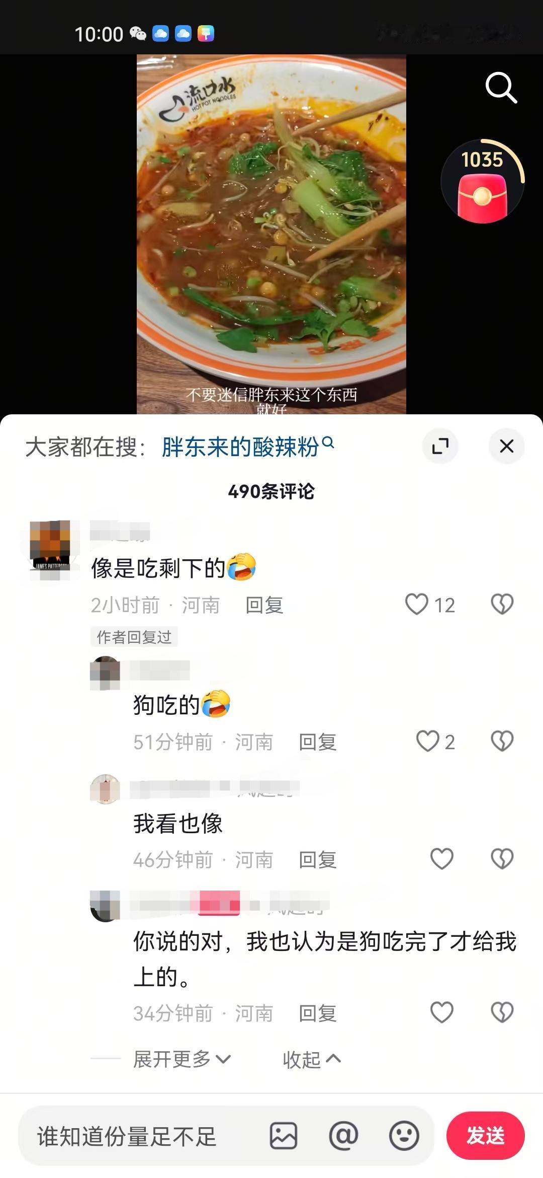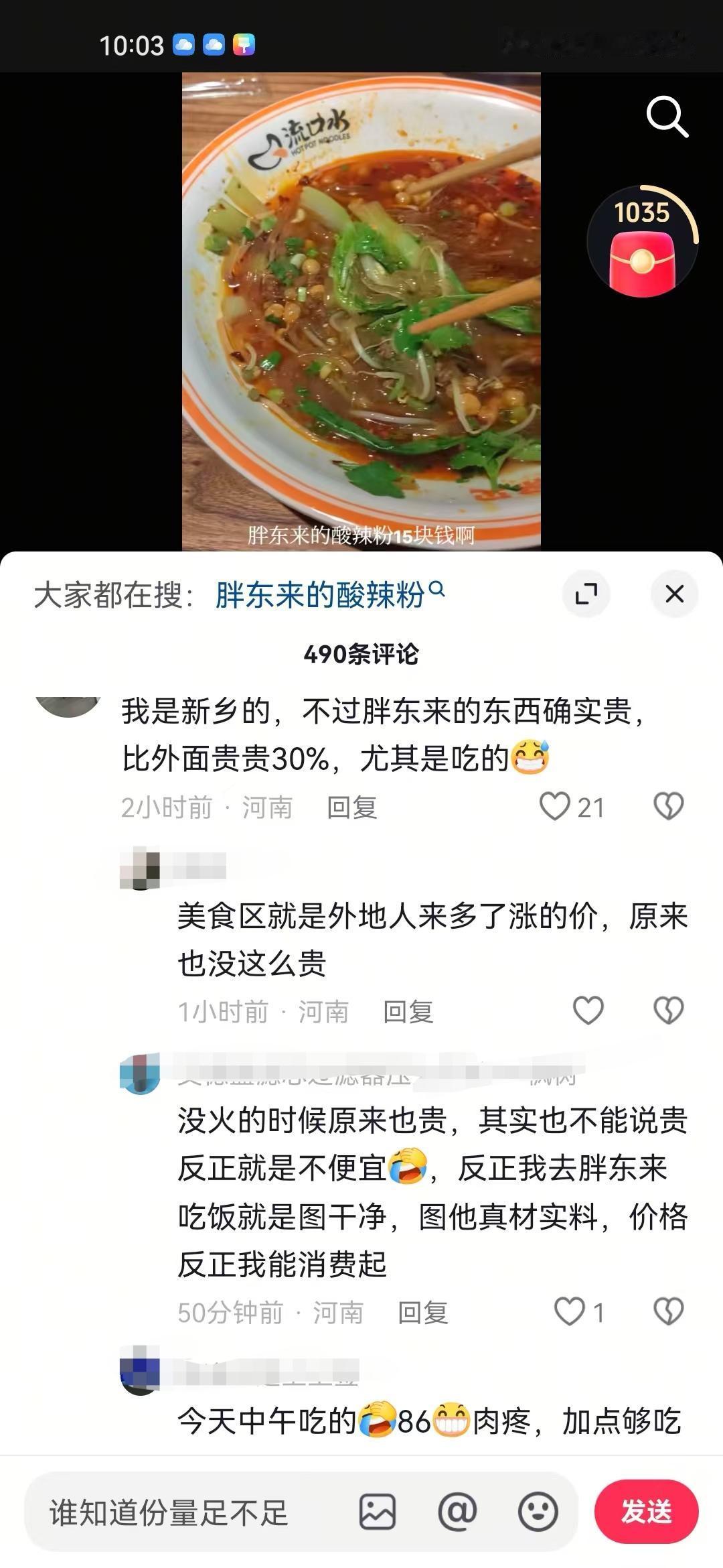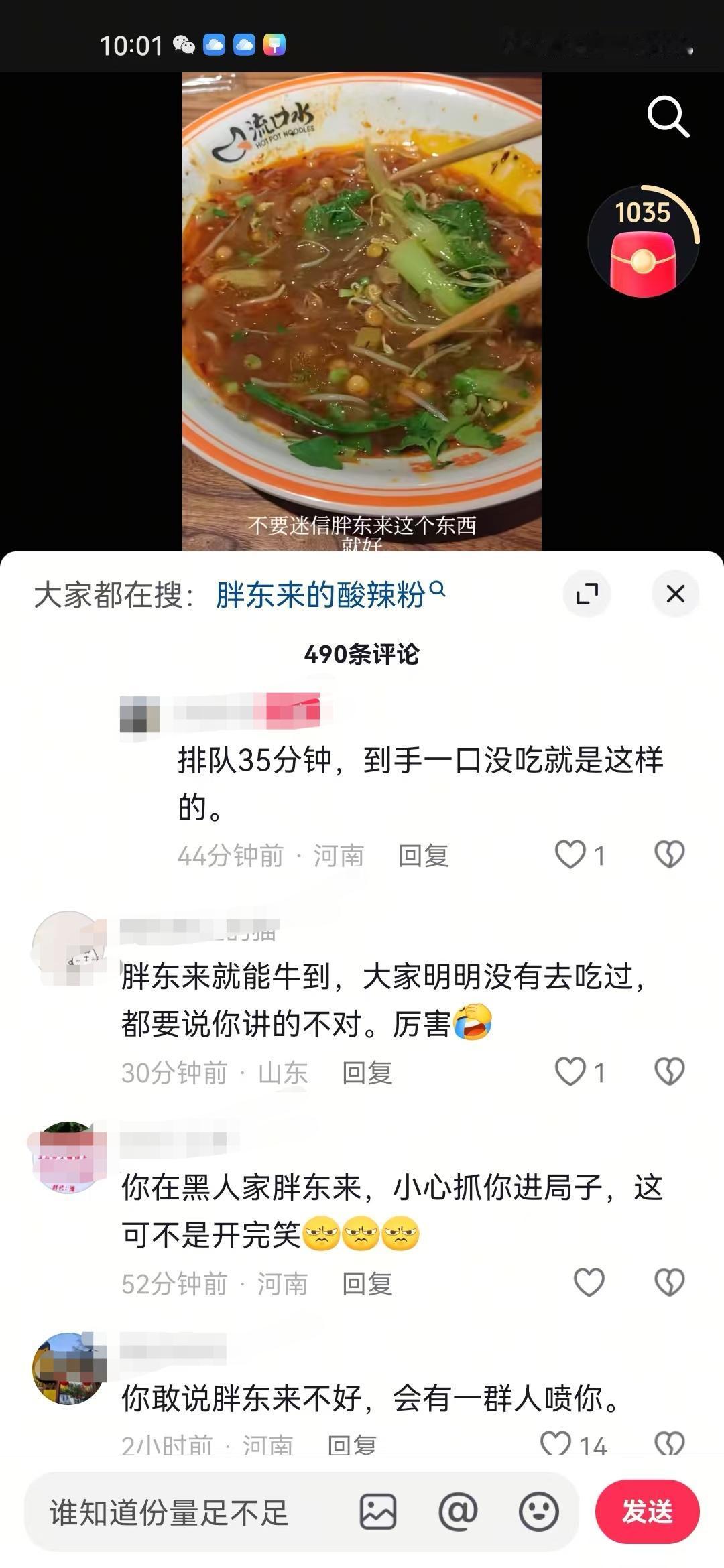 胖东来粉丝究竟有多么维护胖东来,有个网友晒出在胖东来买的15块钱酸辣粉份量,结果胖东来粉丝又是说吃了一半,又是说下一个裤头姐、烟头哥啥的。 要说国内哪个超市粉丝忠诚度最高,非胖东来不可,但凡网上出现任何一点不好的问题,粉丝首先就会把矛头指向对方。 有个网友晒出自己排队35分钟吃到的酸辣粉,并且吐槽份量太少,结果被一堆胖东来粉丝抨击。 有的说这个网友自己吃了一半,是故意在摸黑胖东来,这个网友被太多这样的质疑声弄烦了,无奈的说了句狗吃了一半,才给端上来的。 有的说等着被起诉吧,看看曾经的裤头姐、烟头哥,你敢黑胖东来,这是在玩火。 还有的问这个网友的住址,打算找到这个网友去慰问一下。 正如一位网友说的,明明很多人没去吃过,不了解真实的份量到底多少,结果硬是说你讲的不对,说你是黑子,这个就是厉害所在。