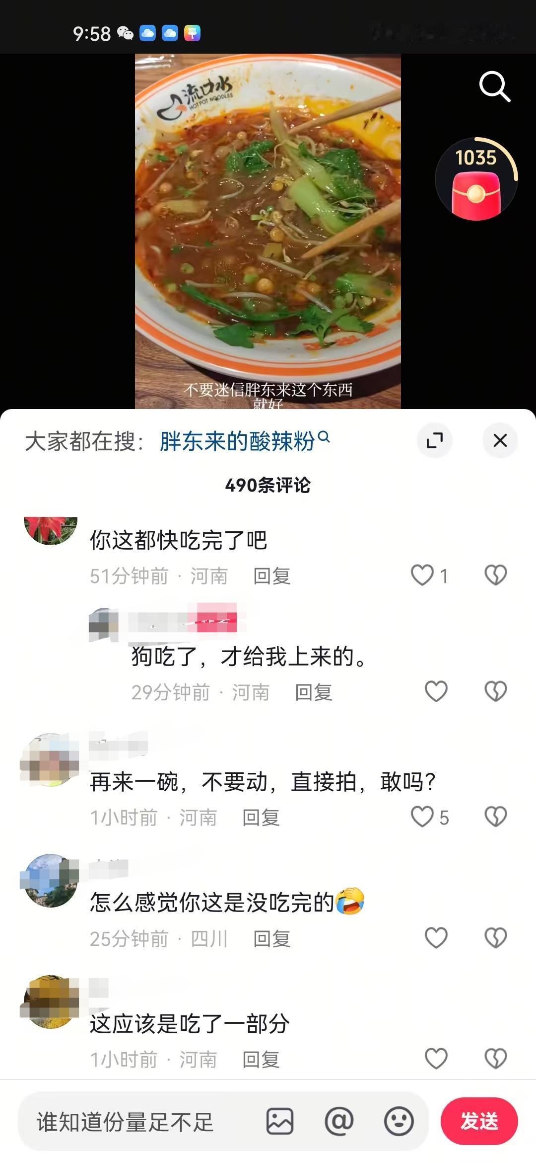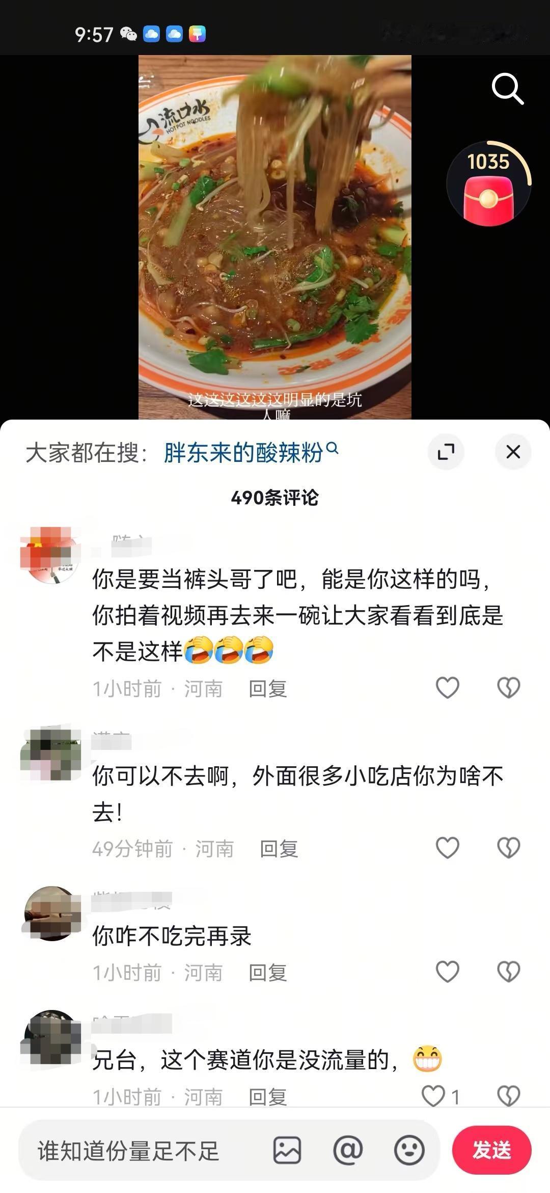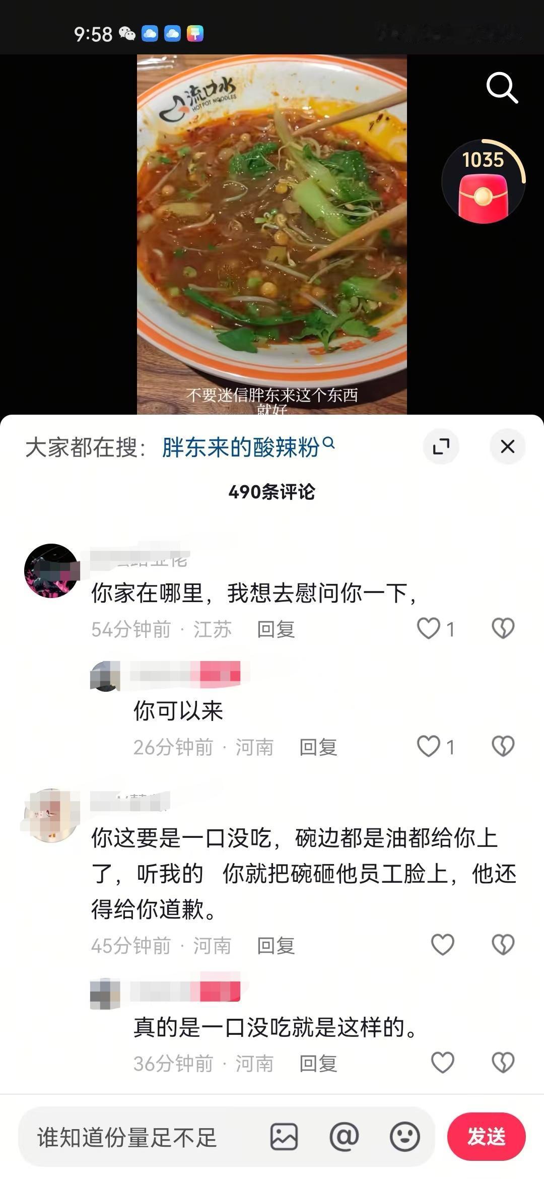 胖东来粉丝究竟有多么维护胖东来,有个网友晒出在胖东来买的15块钱酸辣粉份量,结果胖东来粉丝又是说吃了一半,又是说下一个裤头姐、烟头哥啥的。 要说国内哪个超市粉丝忠诚度最高,非胖东来不可,但凡网上出现任何一点不好的问题,粉丝首先就会把矛头指向对方。 有个网友晒出自己排队35分钟吃到的酸辣粉,并且吐槽份量太少,结果被一堆胖东来粉丝抨击。 有的说这个网友自己吃了一半,是故意在摸黑胖东来,这个网友被太多这样的质疑声弄烦了,无奈的说了句狗吃了一半,才给端上来的。 有的说等着被起诉吧,看看曾经的裤头姐、烟头哥,你敢黑胖东来,这是在玩火。 还有的问这个网友的住址,打算找到这个网友去慰问一下。 正如一位网友说的,明明很多人没去吃过,不了解真实的份量到底多少,结果硬是说你讲的不对,说你是黑子,这个就是厉害所在。