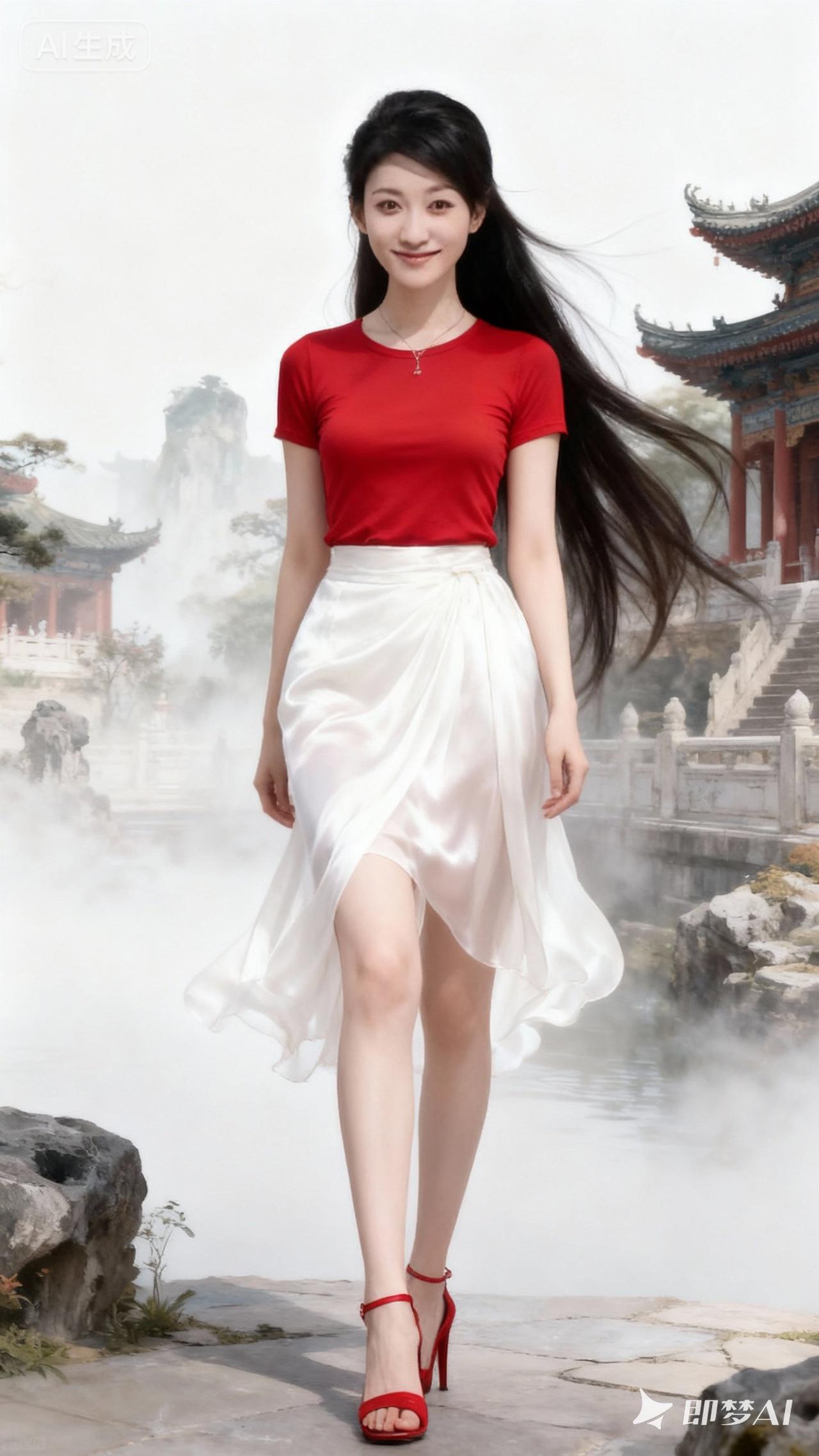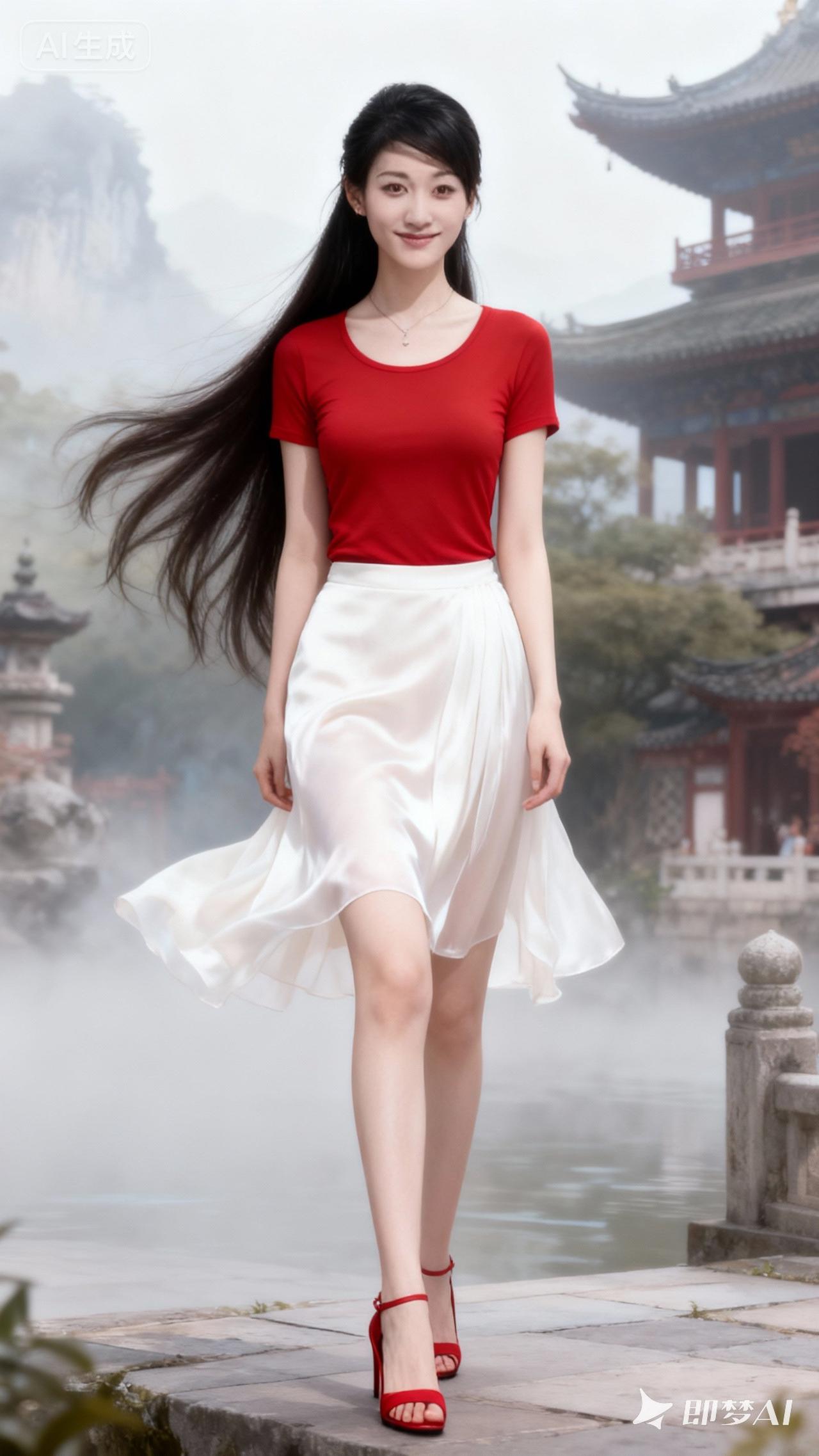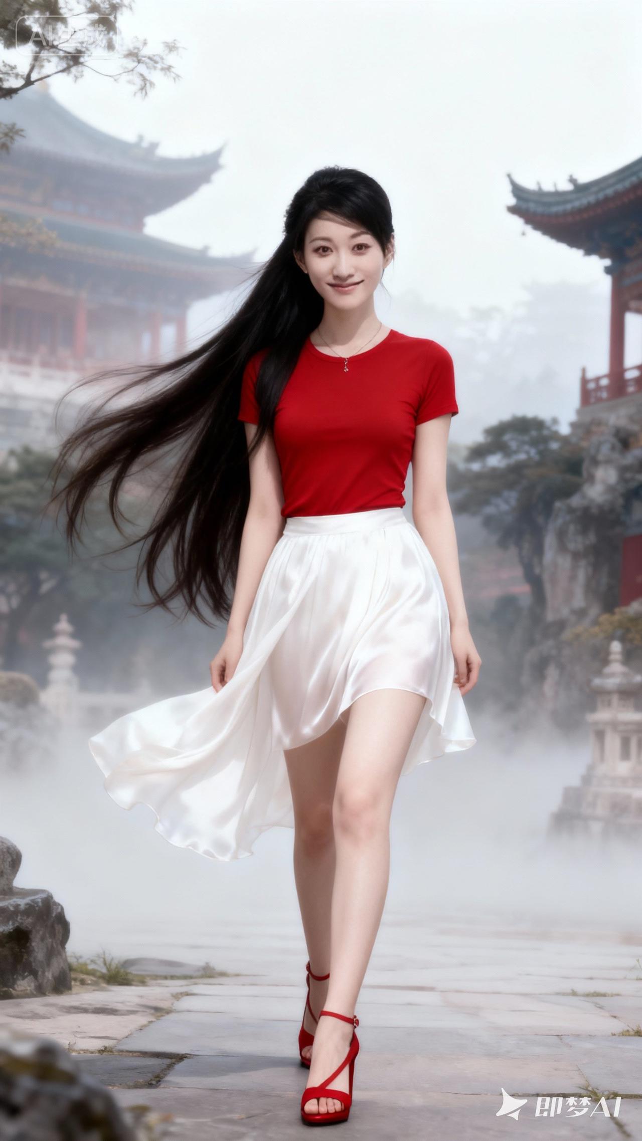 红衣少女漫步古风庭院,古典与现代的完美结合。
