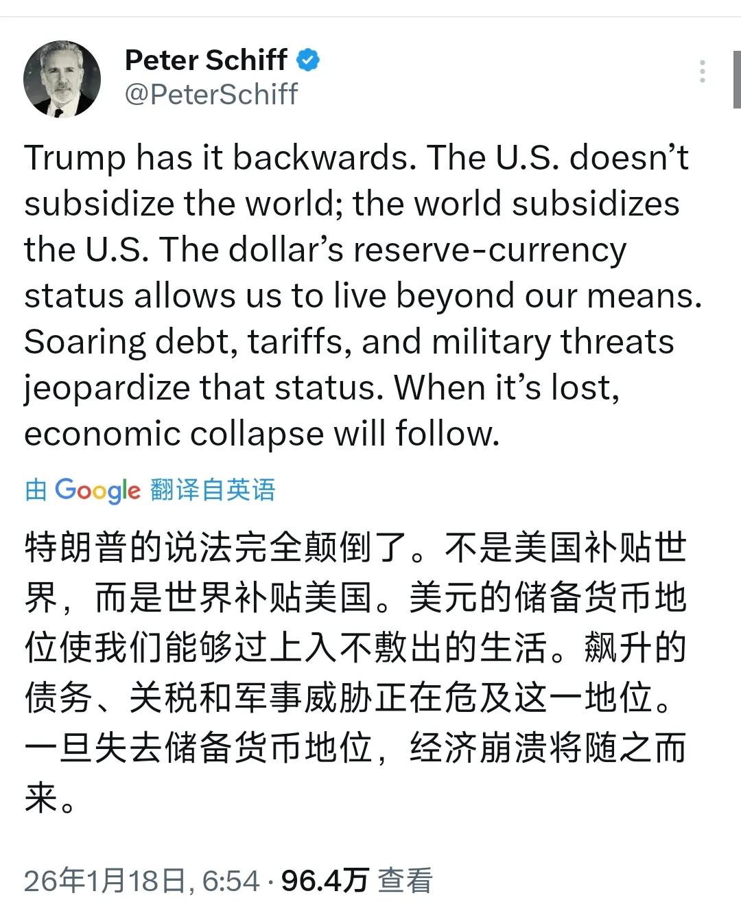 美国经济学家彼德.希夫今天(1月18日)写道:“特朗普的说法完全颠倒了。不是美国补贴世界,而是世界补贴美国。美元的储备货币地位使我们过上了入不敷出的生活。飙升的债务、关税和军事威胁正在危及这一地位。一旦失去储备货币地位,经济崩溃将随之而来。” 自克林顿任职结束后,美国财政一直入不敷出,特朗普第一任期接手时,美国国债17.9万亿美元,仅仅过了九年时间,美国债总额已突破38万亿美元,每年以2万多亿美元的速度递增,上年度举债数额创年度历史新高。尽管特朗普一再宣称美国经济一片欣欣向荣景象,上年度GDP或将增长3%以上,股市也屡创新高,但难掩美国财政入不敷出、不断恶化的境况,举债数据不会说谎。