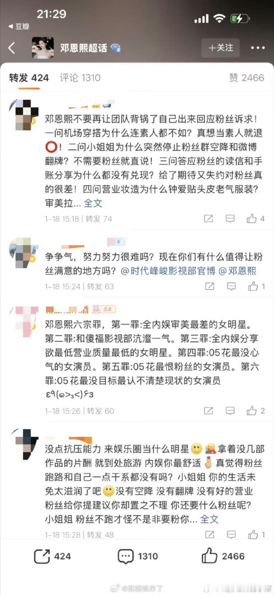 邓恩熙粉丝贴脸邓恩熙,直接指她六宗罪,要求本人出来回应内娱一般都是怪团队怪经纪人的,直接怪正主的很少见了