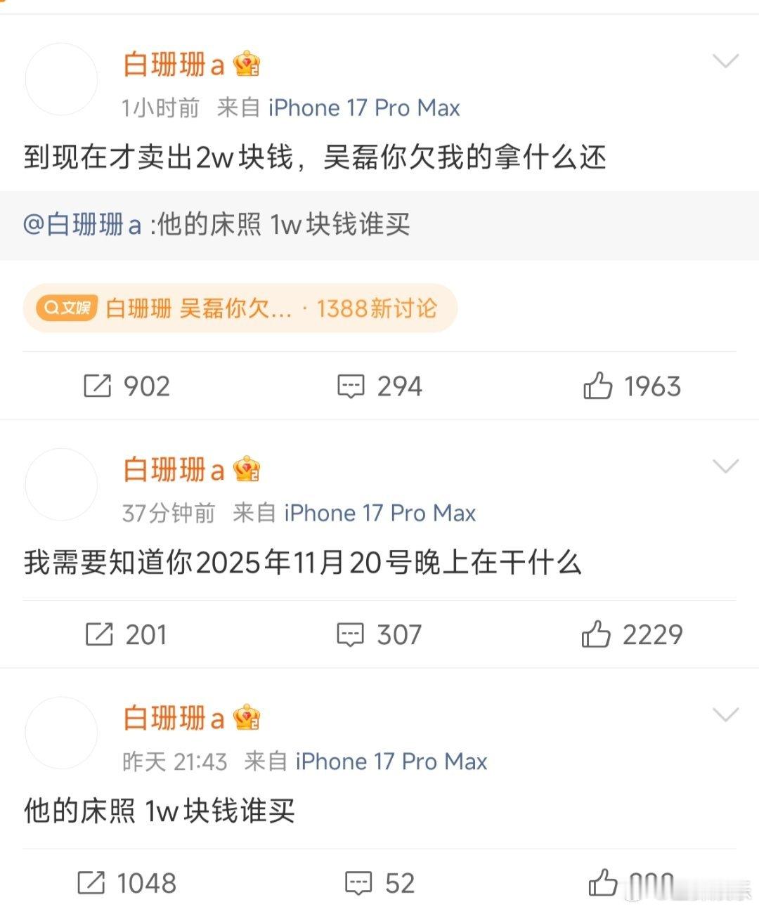 白珊珊 吴磊你欠我的拿什么还 床照一万一张,喊了两天,总共就卖出去两张。转头就对着空气喊话:“吴磊你欠我的拿什么还?”不光喊话,还点名要查人家去年11月20号晚上的行程。要真有东西,早该甩出来了,到现在还是全凭一张嘴。翻翻她之前的微博,画风挺迷。一边教人怎么发照片“拿捏男人”,一边又同情别人“混得惨”。现在突然跳出来卖顶流隐私,话里话外还暗示自己“睡的男明星更帅”。是真有恩怨,还是纯想火,真不好说。
