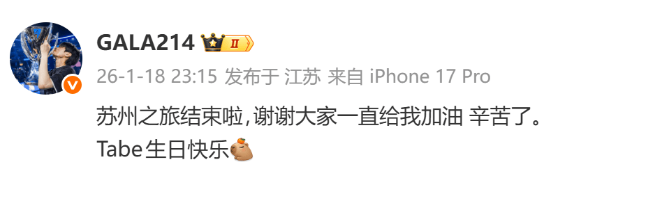 虎扑01月18日讯2026LPL第一赛段常规赛JDG以2-1的比分战胜AL,赛后GALA发文: