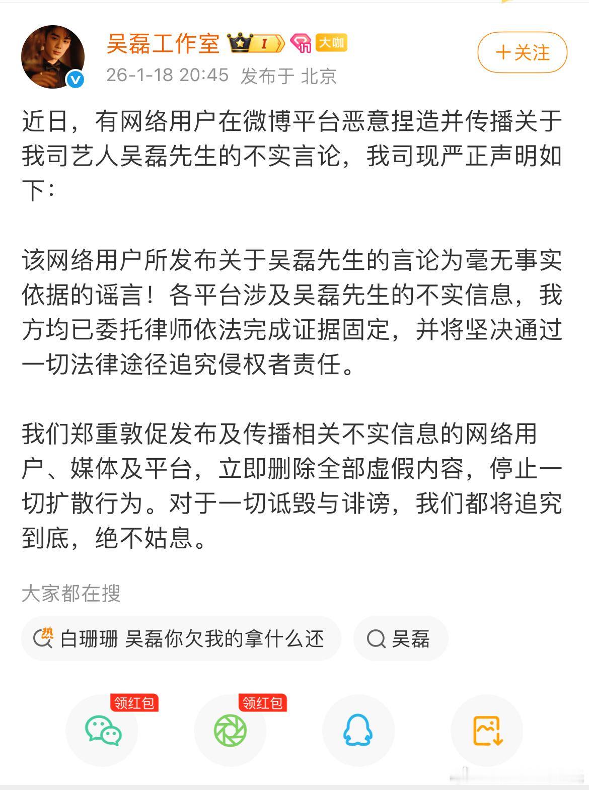 吴磊工作室严正声明那个白珊的IP据说变来变去吴磊工作室火速辟谣了目前只有文字无图