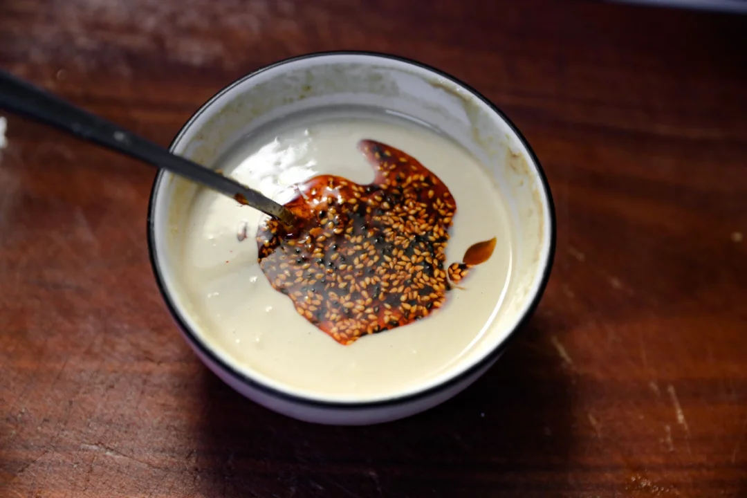 🌟3.顺着一个方向搅拌直至芝麻酱和水混合成均匀的酱汁。