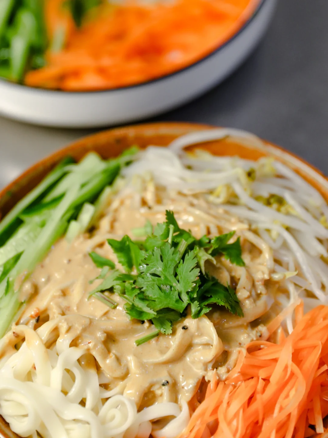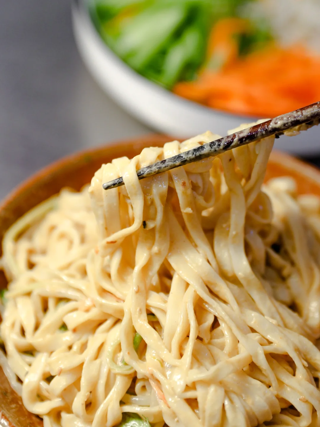 🌟5.面条煮熟之后过一下凉水,倒入调好的芝麻酱汁,放入蔬菜,撒上白芝麻和香菜即可。