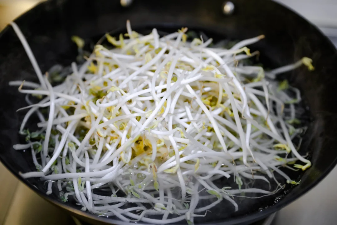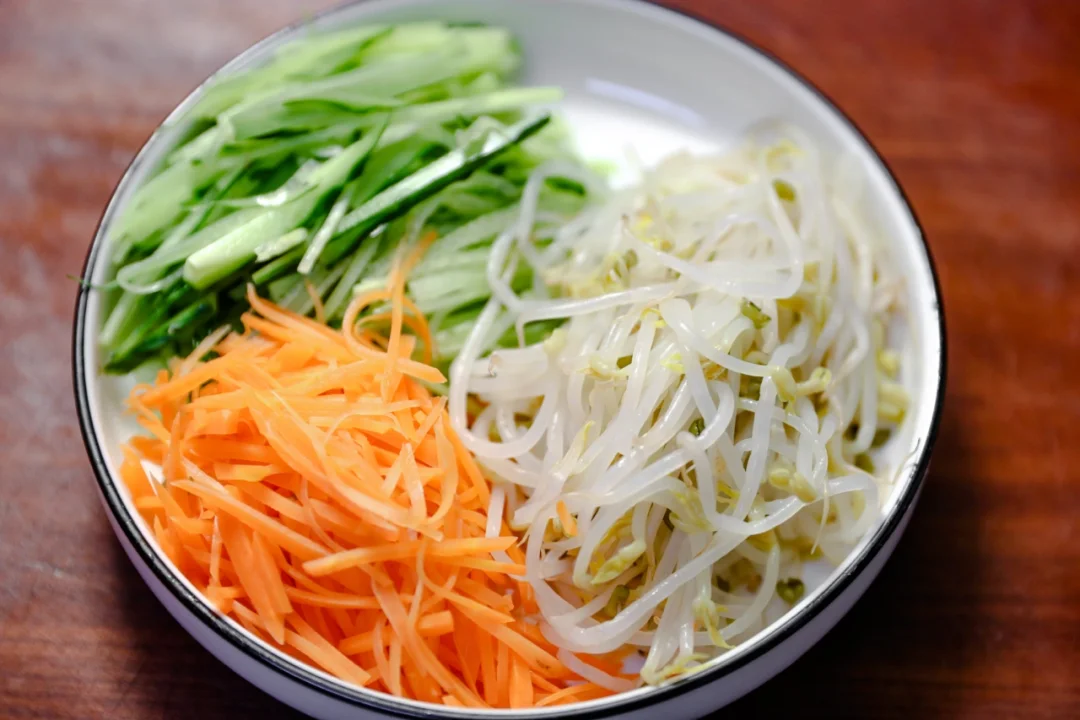 🌟1.胡萝卜,黄瓜分别切丝。绿豆芽清洗干净之后,放入沸水中汆烫一下,沥干水分,胡萝卜也是同样的方式操作。