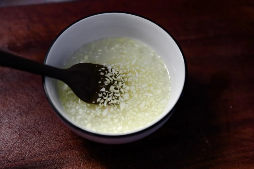 🌟2.蒜泥放入一个碗中,加入适量的白糖和凉白开,放入芝麻酱。