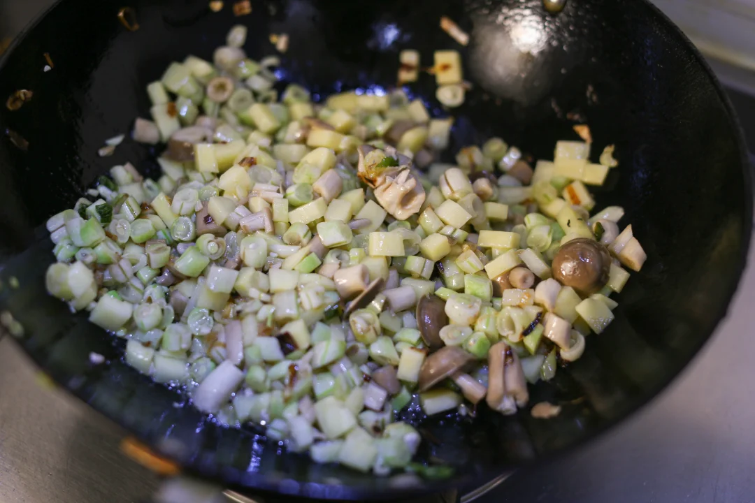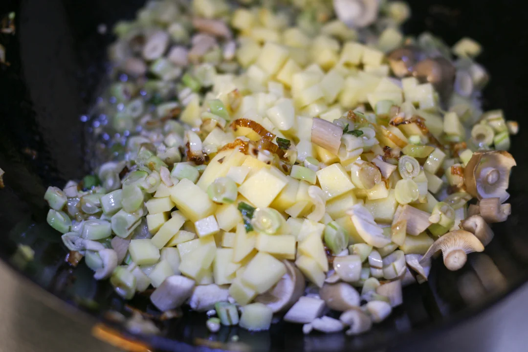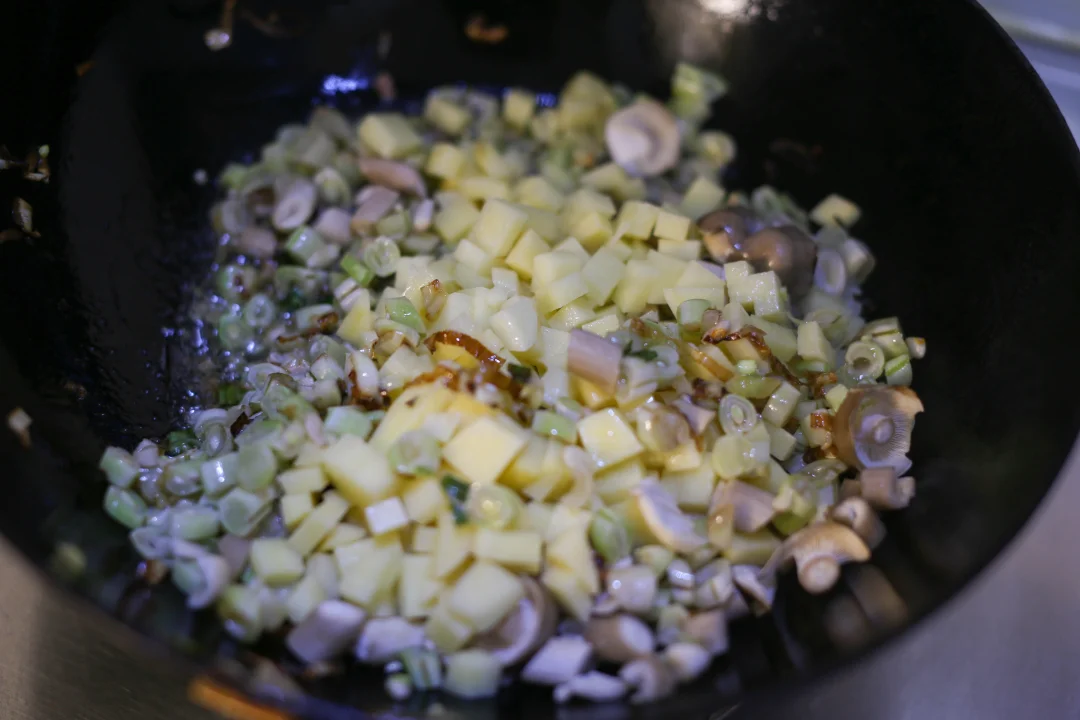 加入芸豆丁,中火翻炒至变色,加入土豆丁和鹿茸菇丁。
