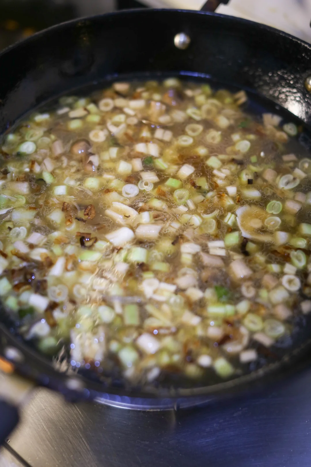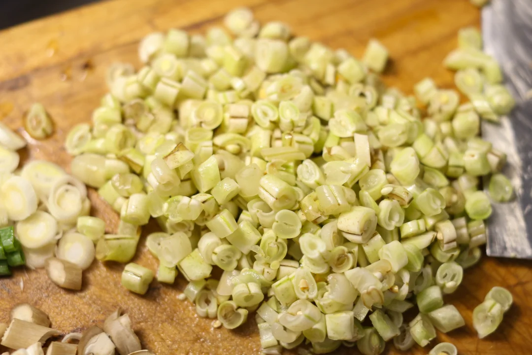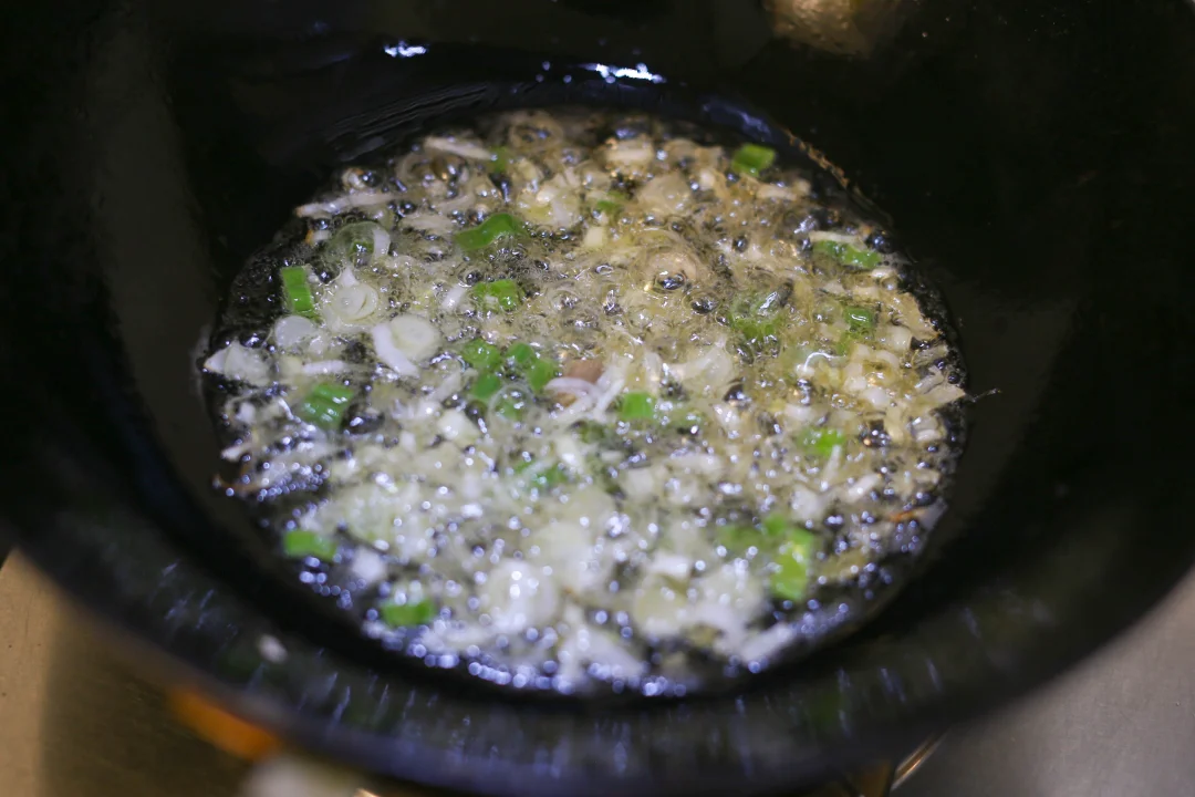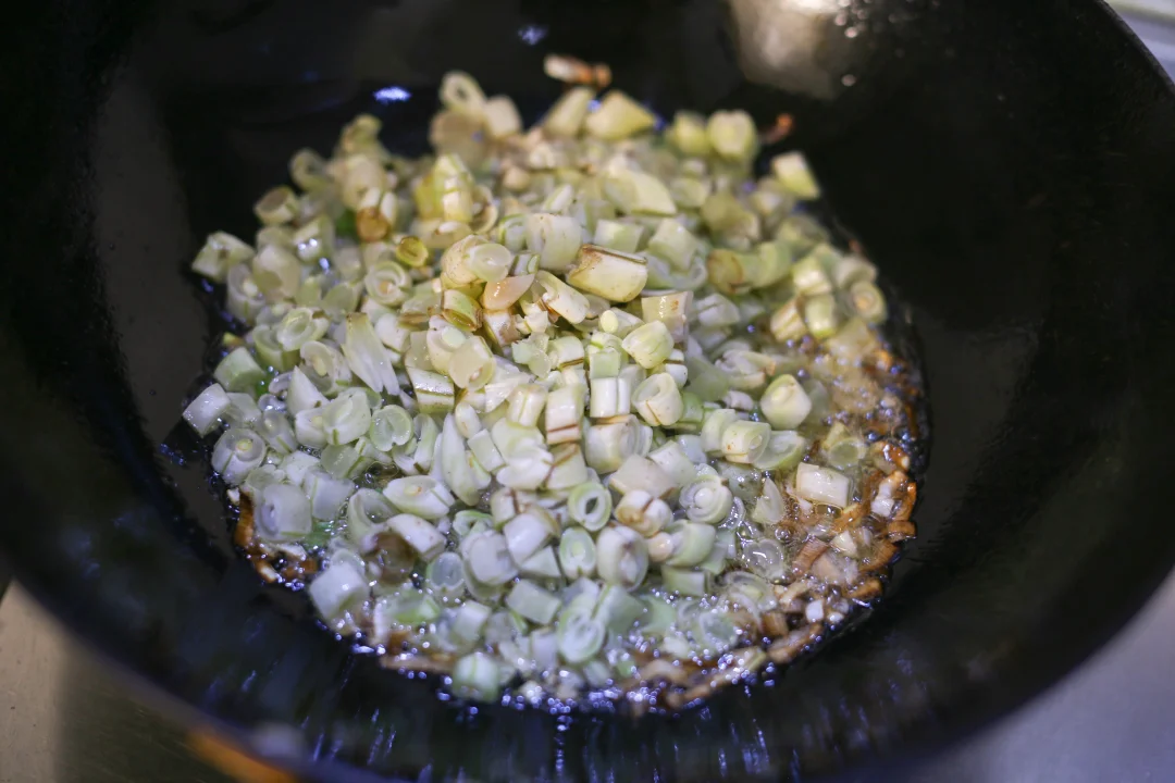 热锅冷油,加葱花饼爆香,一定炒出葱变成金黄色,炒出葱油。