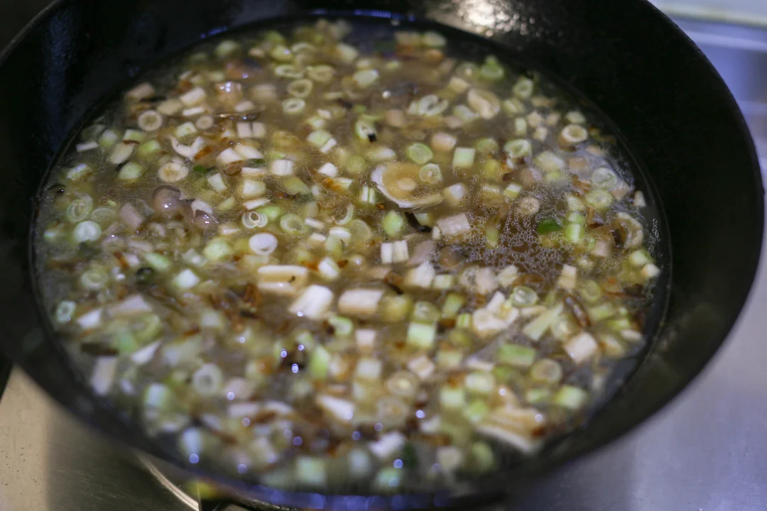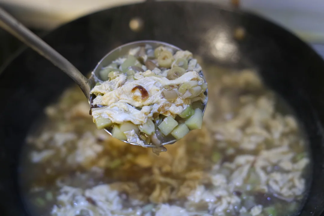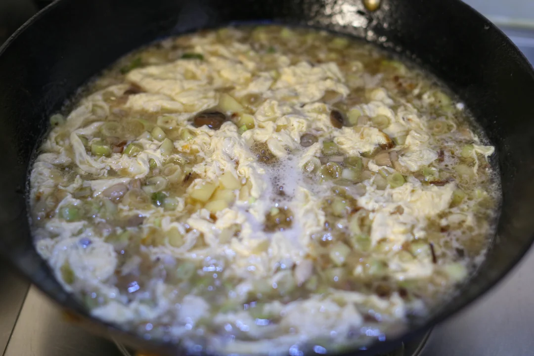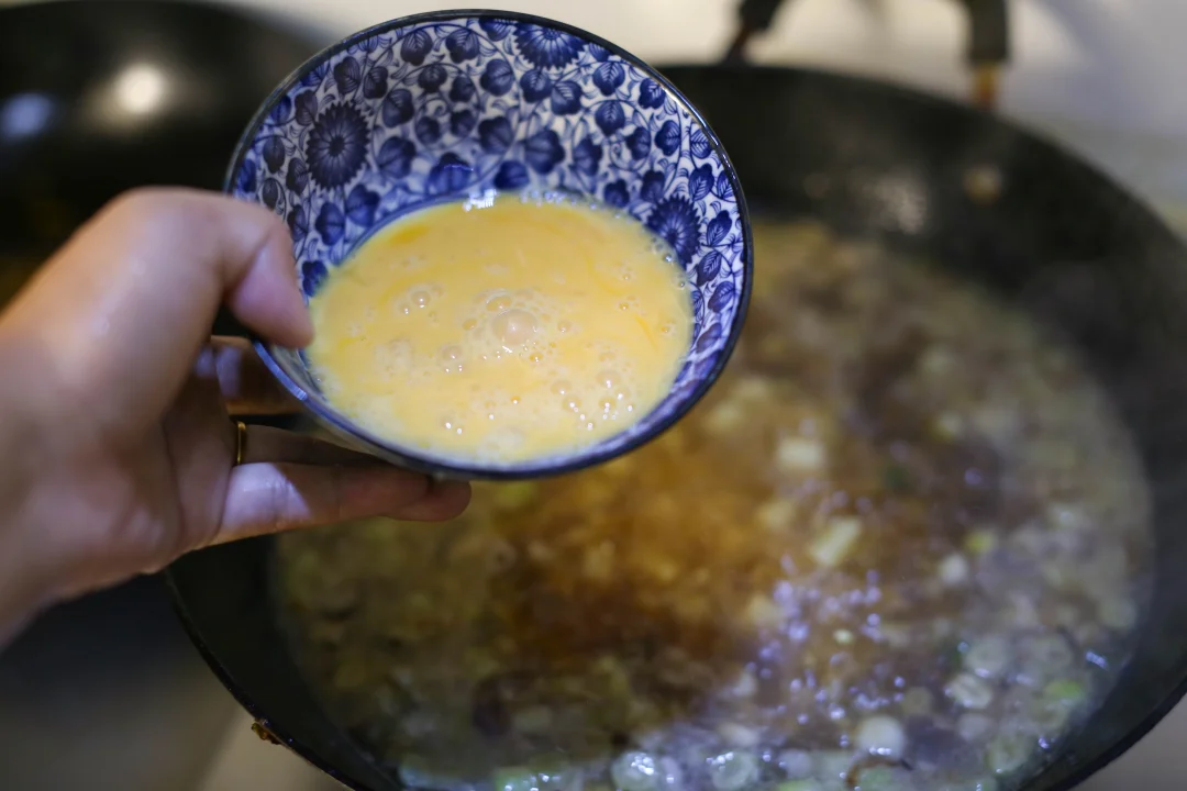 汤汁剩一半时,加盐调味,淋入打散的鸡蛋液搅成蛋花,滴香油关火。