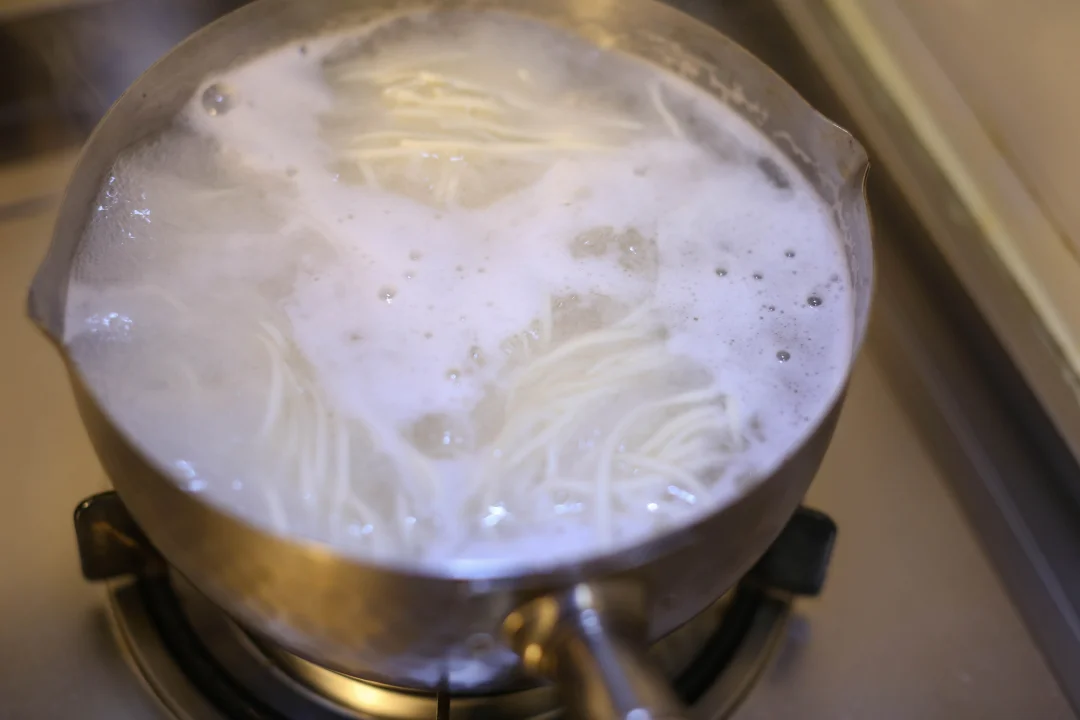 另起锅烧水,水开下面条,煮至无硬芯后捞出过凉水(更筋道)。
