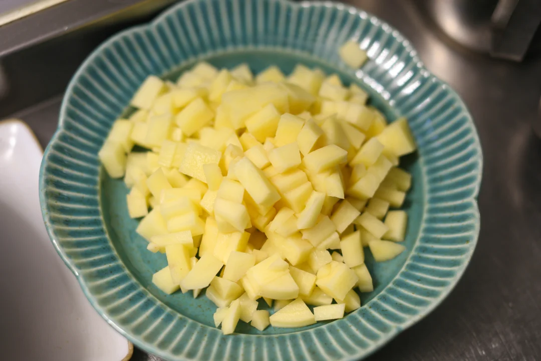 芸豆去筋切小丁,土豆去皮切丁,大葱斜切成片或者颗粒状都可以。