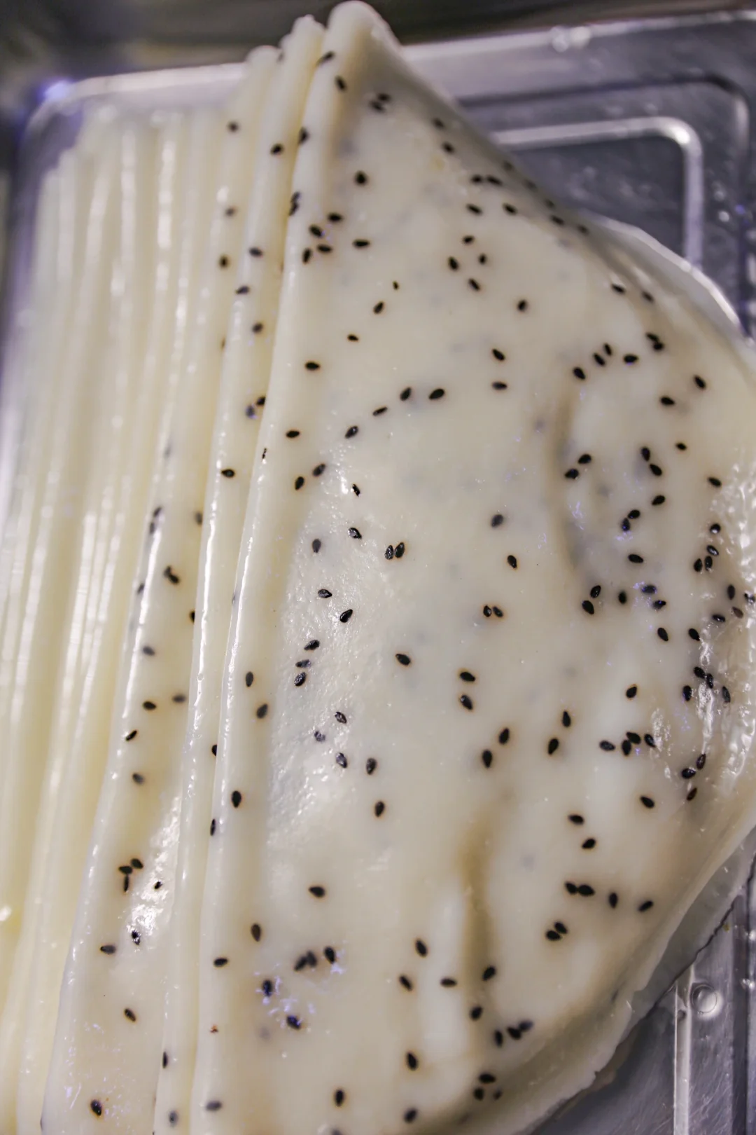 凉皮锣锣用刷子刷上食用油,舀上一勺淀粉水(大约90克),来回转圈转均匀,开水上锅蒸3分钟,放入一个凉水盆中,等稍微变凉,将面皮揭下来即可,以此类推,把剩下的淀粉水做完即可。