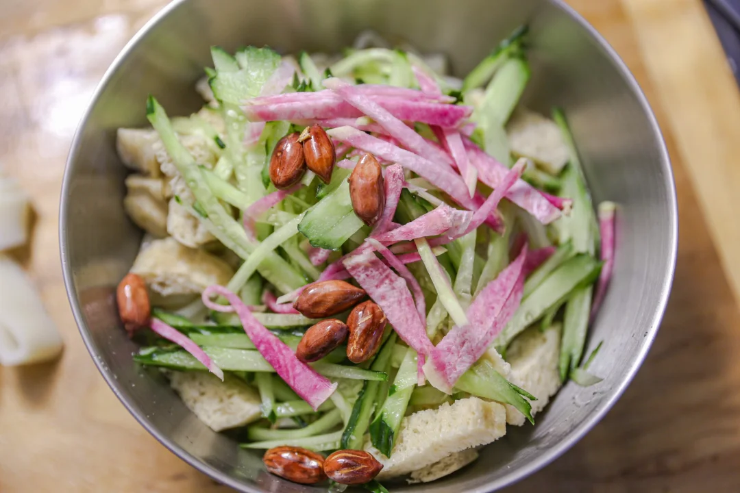 料水的制作:清水中加入桂皮、花椒、八角、香叶煮滚后,关火。加入白糖、鸡粉、食盐、生抽、蒜泥、香醋搅拌均匀。