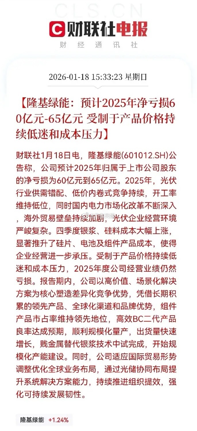 深夜10点20分,多家光伏龙头公司突发业绩预告,看完这些业绩预告,满仓光伏的恐怕要哭了!通威股份亏损90亿元-100亿元TCL中环亏损82亿元-96亿元隆基绿能亏损60亿元-65亿元晶澳科技亏损45亿元-48亿元爱旭股份亏损12亿元-19亿元业绩对于股价短期走势影响:行业整体仍处寒冬,业绩的疲弱会持续压制板块整体情绪,导致个股低位震荡,短期不宜对光伏板块有整体性的大幅上涨预期业绩亏损三大主要原因:第一是严重的供需失衡,第二是价格战,第三是国际贸易环境复杂化反内卷政策对行业的三大影响:第一加速行业洗牌与出清,第二是价格竞争转向技术竞争,第三是重塑企业战略和格局未来展望:短期阵痛难免,长期前景依然光明,保持信心!