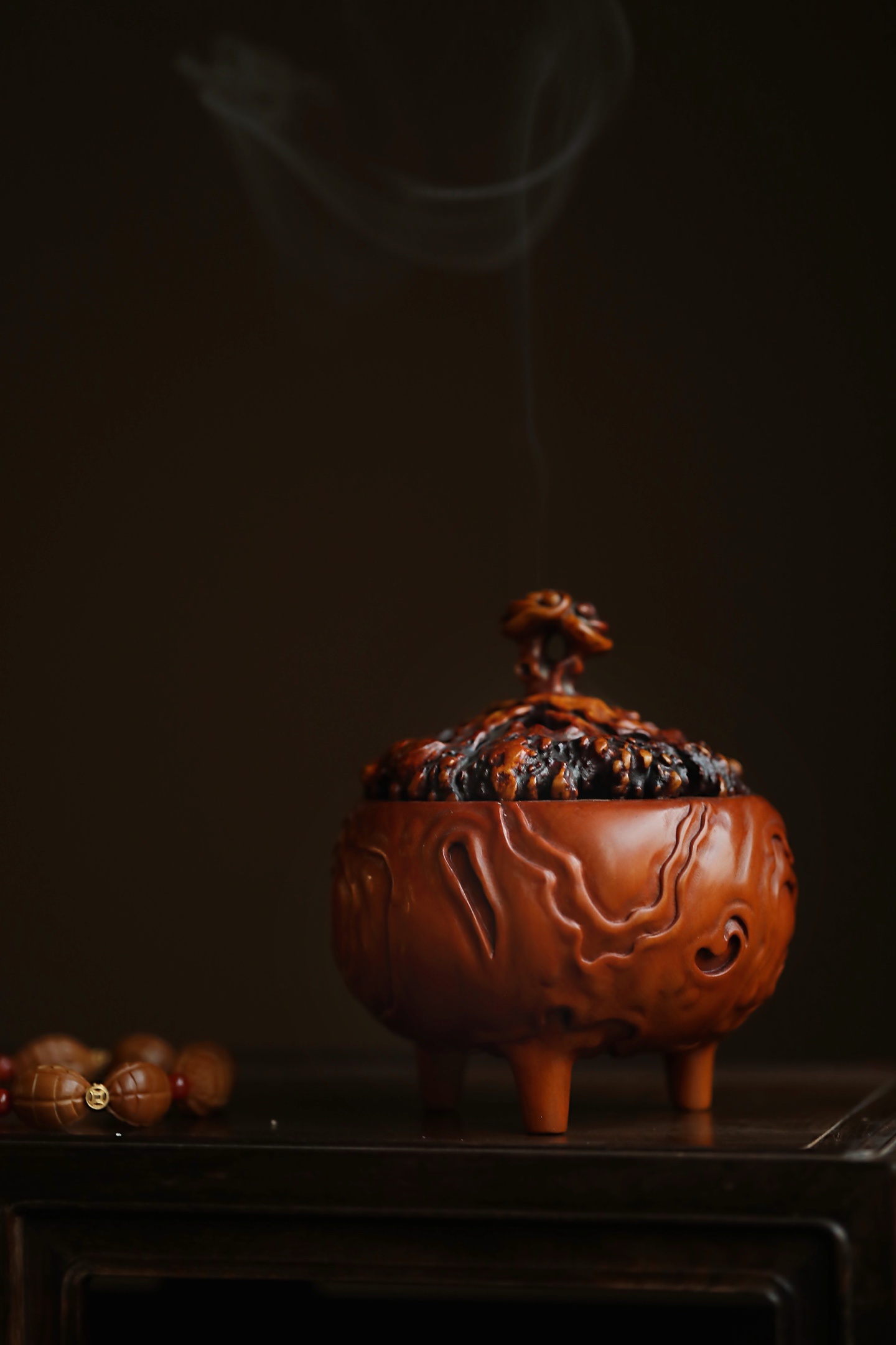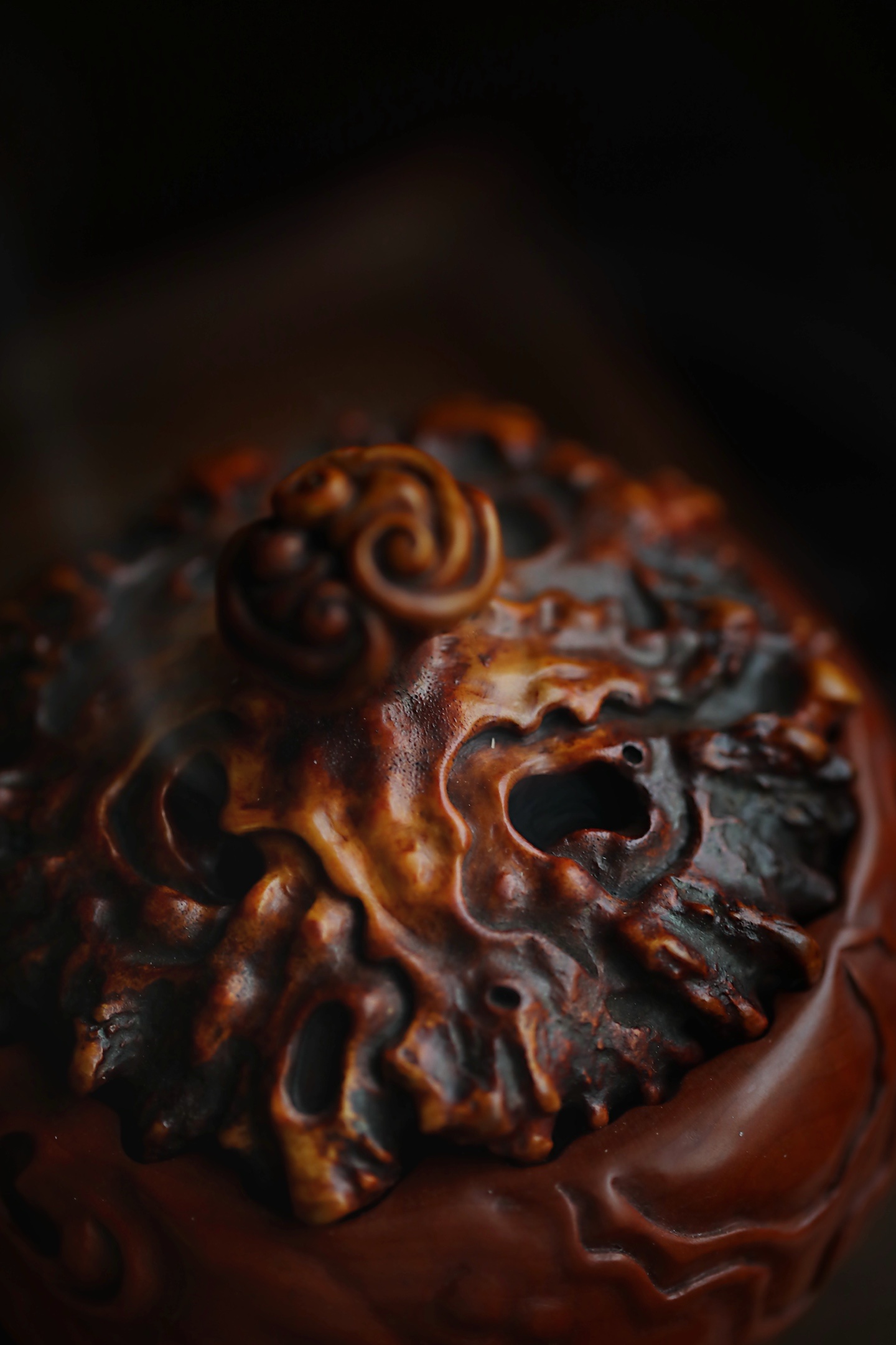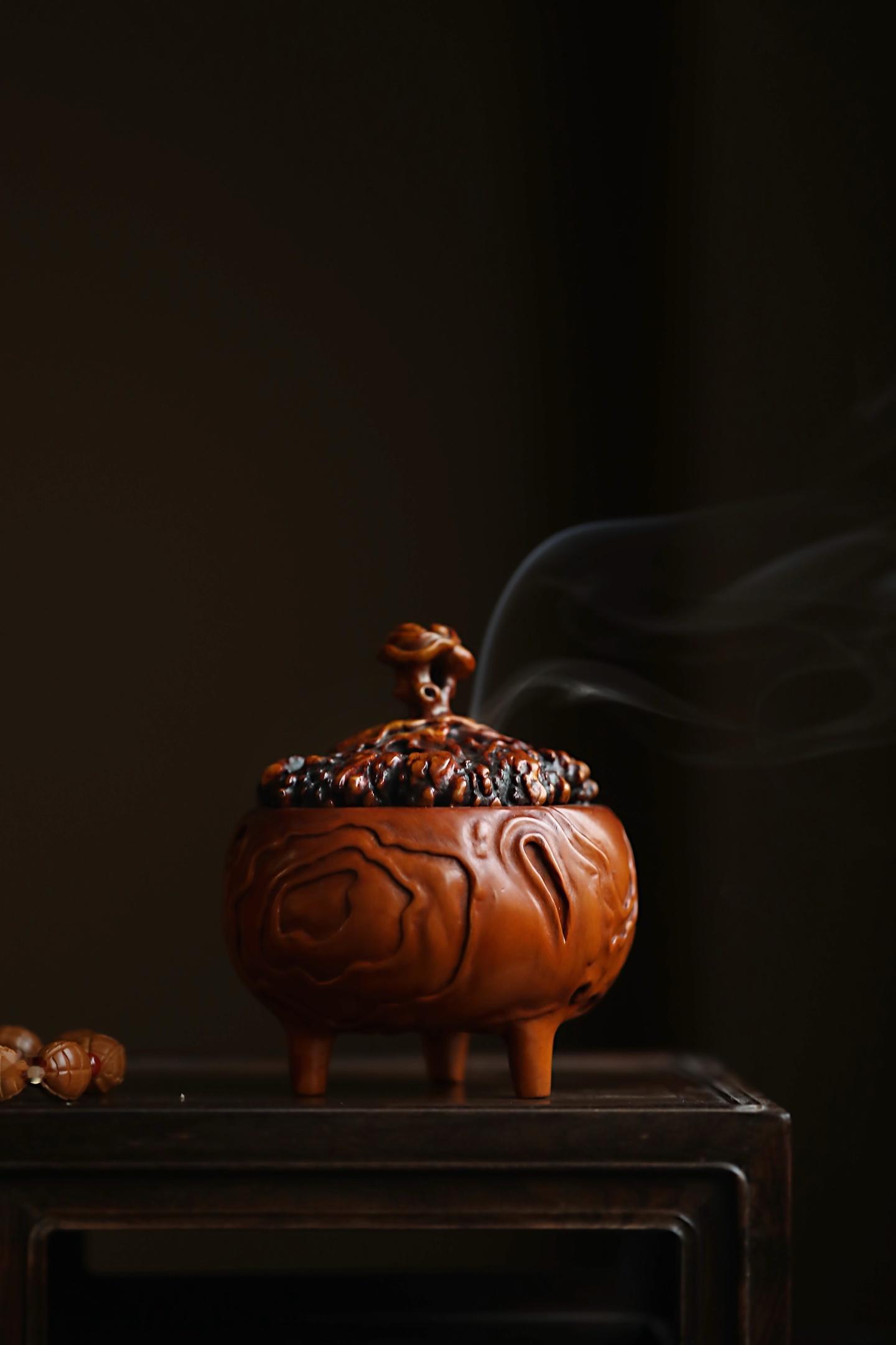 鹿角×黄杨木 | 三足香炉全手工精细雕琢,极考究匠人耐心,制作繁杂,鹿角炉盖,镂
