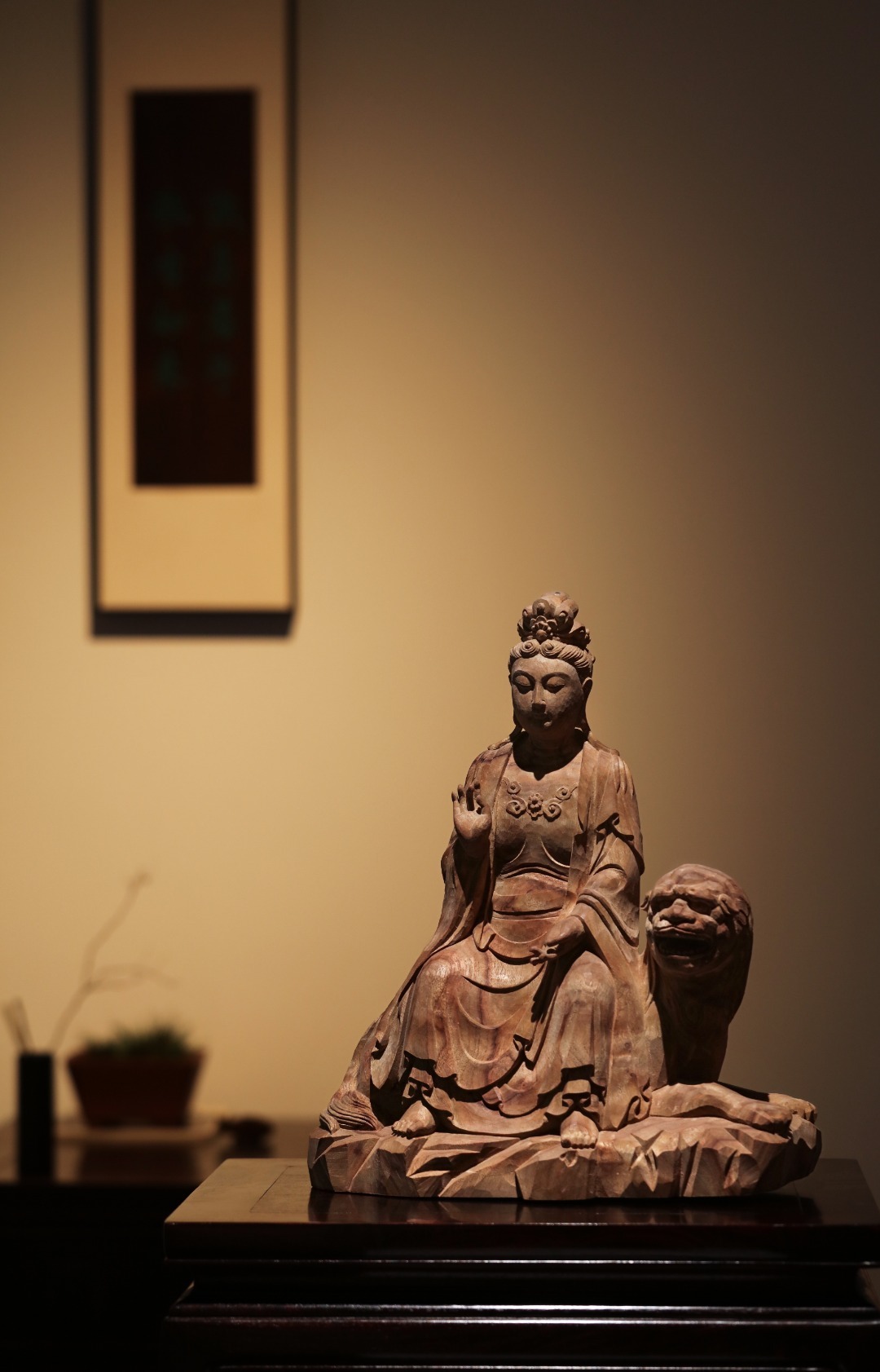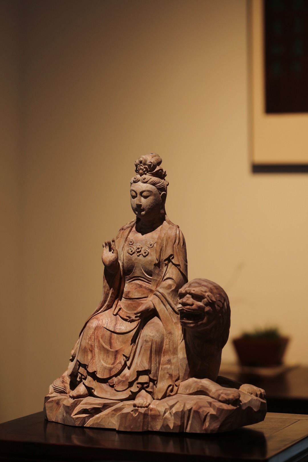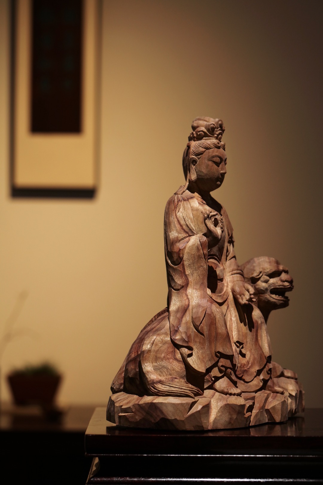 百年香樟木 | 文殊菩萨 取材台湾百年香樟木,一木雕琢,菩萨慈悲悯人,刻划生动,座下卧狮,造型美观,衣袍处理如行云流水,舒畅有度,姿态优雅,香气醇厚,空间陈置,意境悠远。37*20.5*42.8cm 重7230g