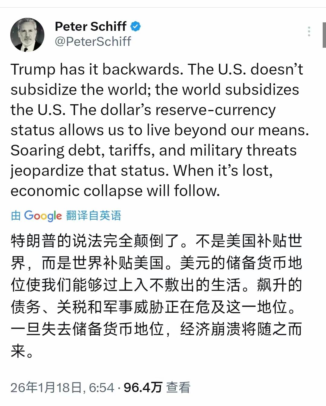 美国知名经济学家彼得·希夫今天(北京时间1月18日晚)写道:“特朗普的说法完全颠倒了。不是美国补贴世界,而是世界补贴美国。美元的储备货币地位使我们能够过上入不敷出的生活。飙升的债务,关税和军事威胁正在危及这一地位。一旦失去储备货币地位,经济崩溃将随之而来。”