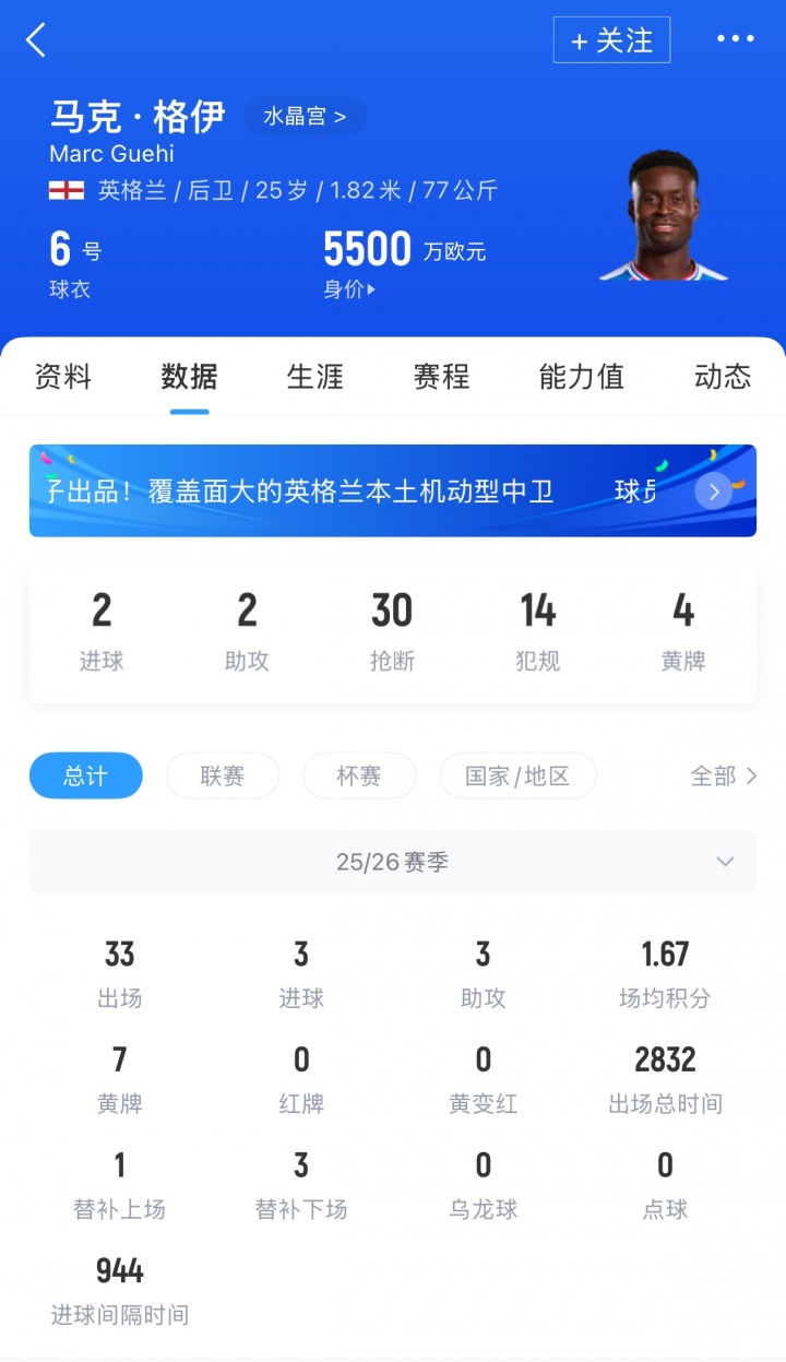 格伊现年25岁,司职中卫,他本赛季为水晶宫出场33次,贡献3球4助,他与水晶宫的合同在赛季末到期,现身价5500万欧。