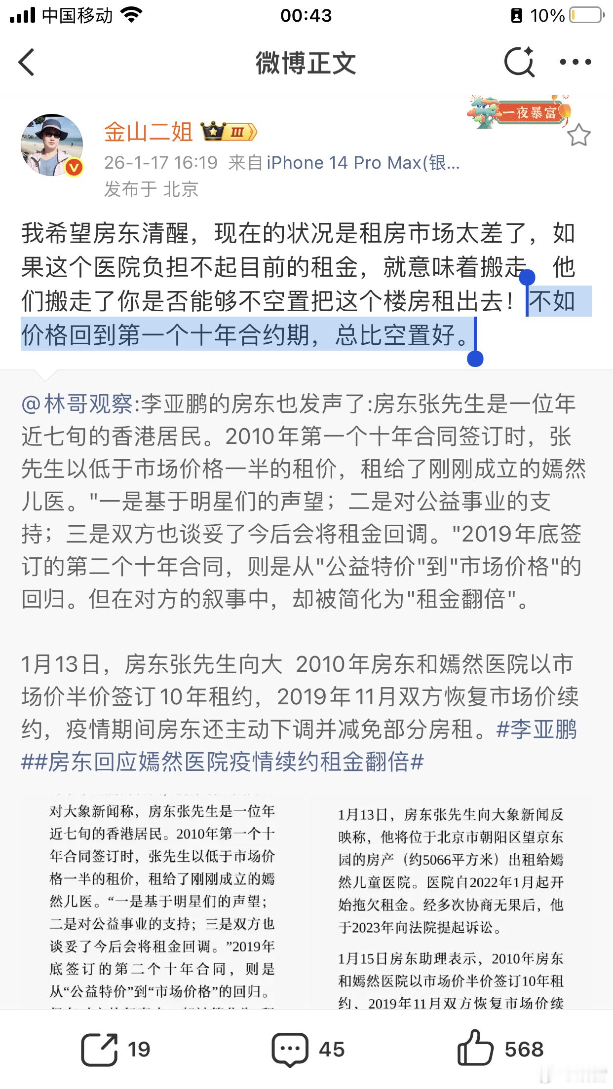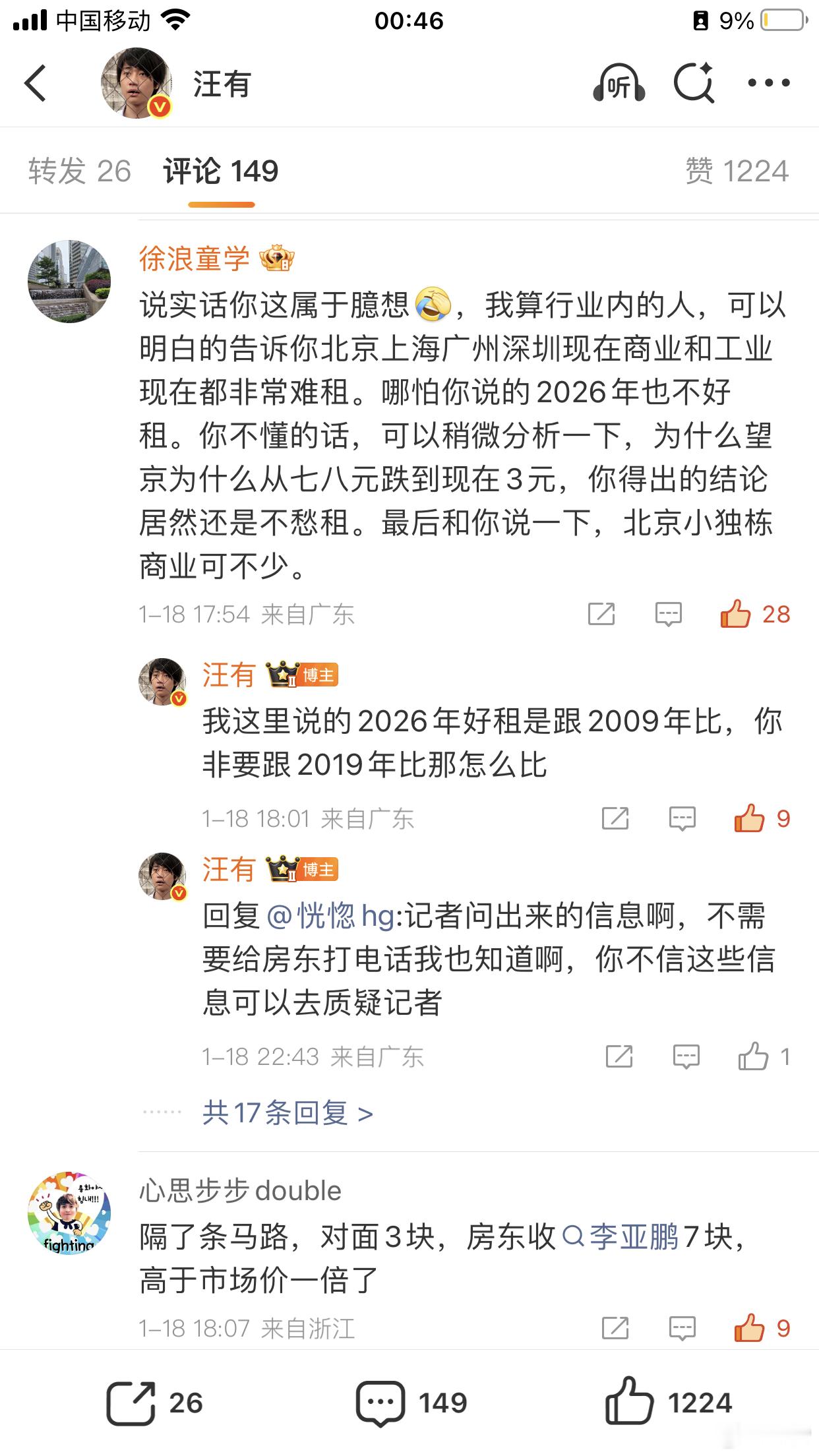 在2009年的望京,肯定不好租。在2026年的望京,好租。看看金山二姐和汪有,哪个判断准。感性上站二姐,残酷上相信房东,正如汪有判断,赶李亚鹏走,应该是找到下家。