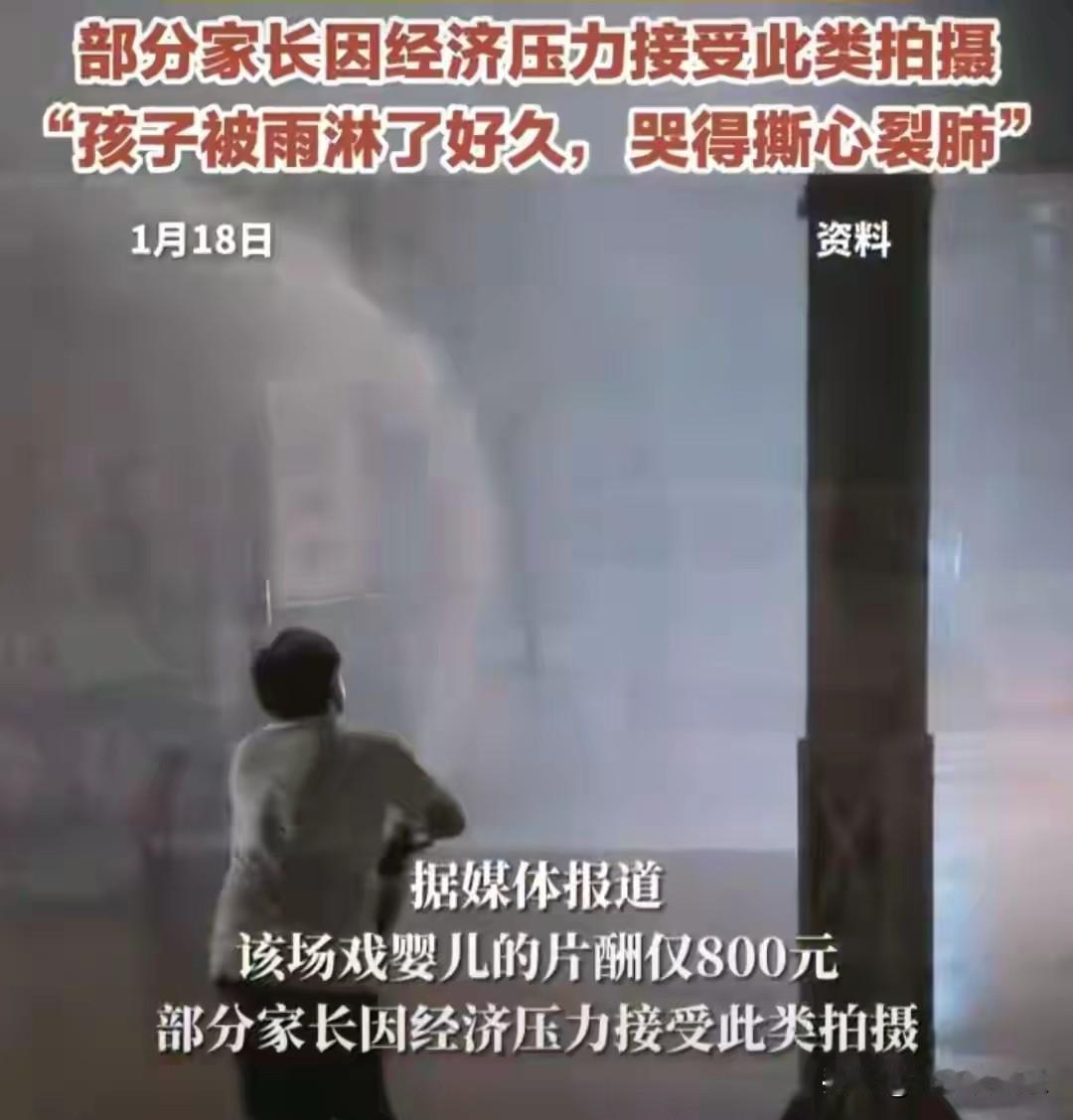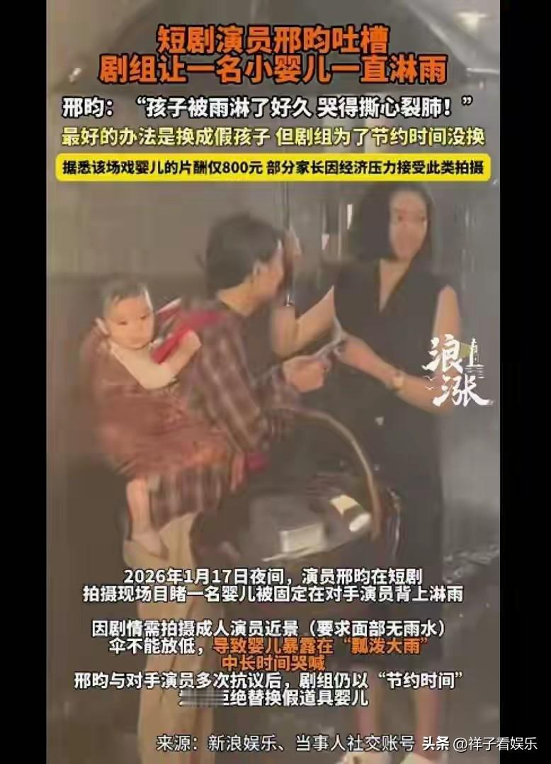 2026年1月17日夜间,短剧演员邢昀在社交平台发文,实名揭露某剧组在深夜拍摄雨戏时,让一名真实婴儿在人工制造的瓢泼大雨中持续淋雨近半小时,婴儿哭得撕心裂肺,剧组却以“节约时间”为由拒绝使用假婴儿道具替换。事件迅速发酵,登上热搜榜首,引发全网对短剧行业乱象的声讨。据邢昀透露,该场戏需要拍摄成人演员的近景,要求她们脸上不能有雨,因此伞必须高举。结果,绑在女演员背上的婴儿被完全暴露在洒水车冰冷的水柱之下,哭声贯穿整个拍摄现场。邢昀提出用假婴儿道具替。