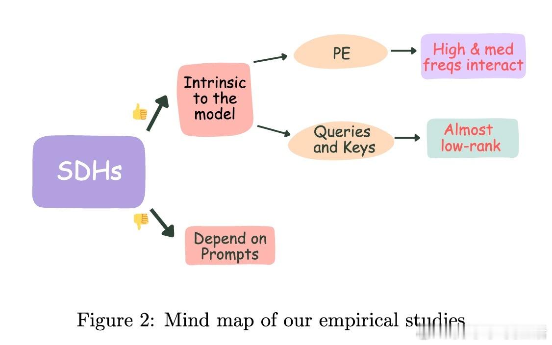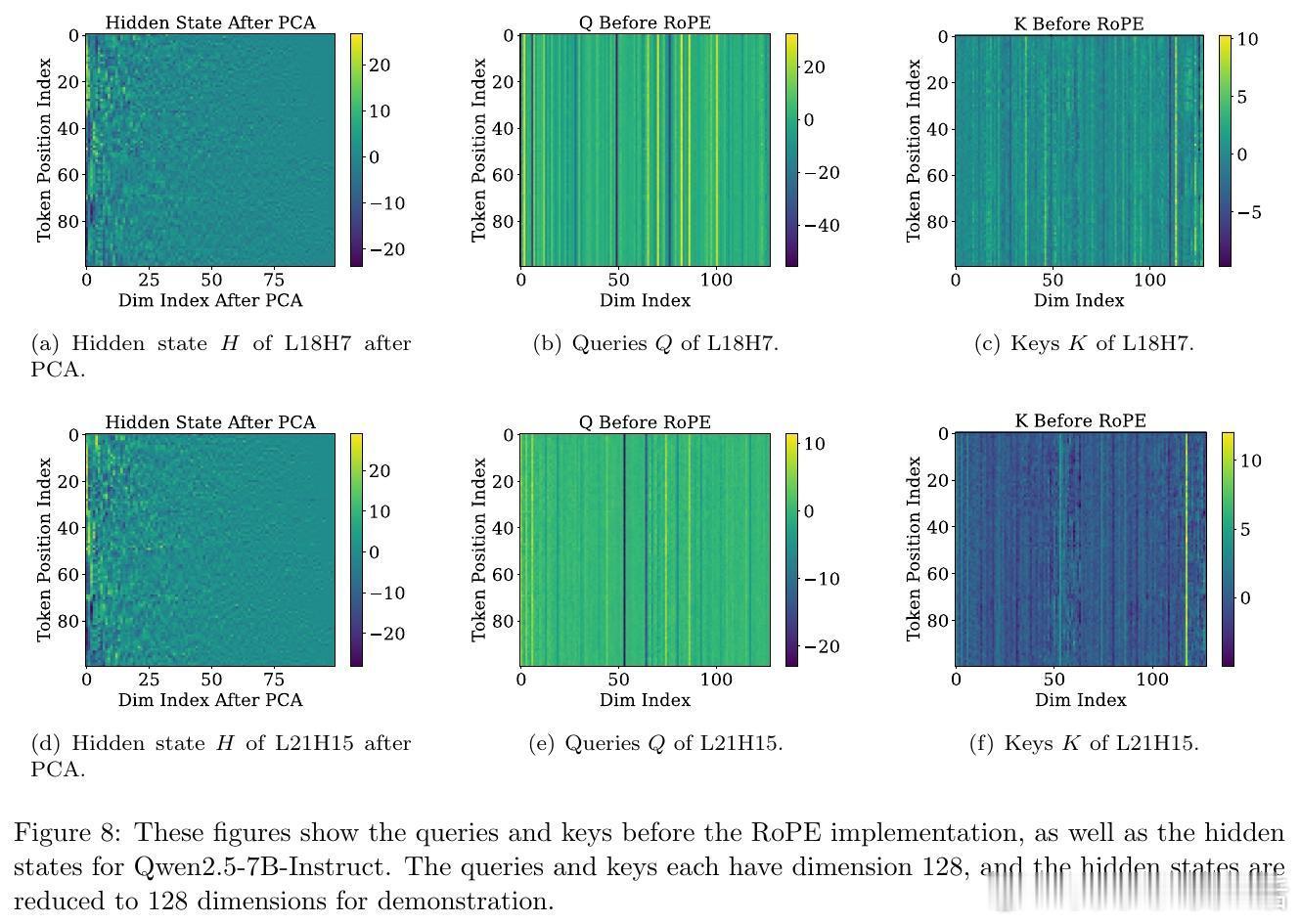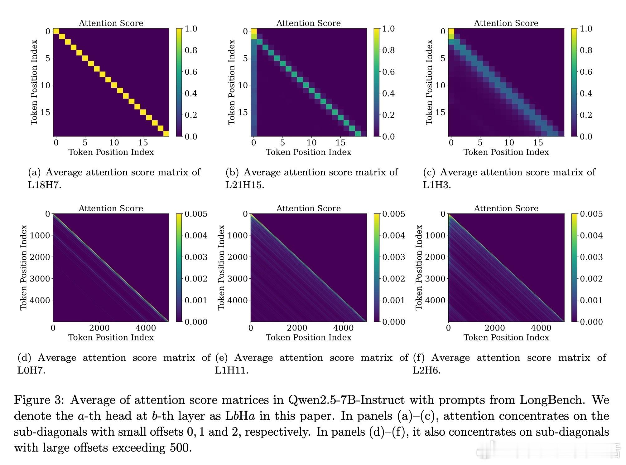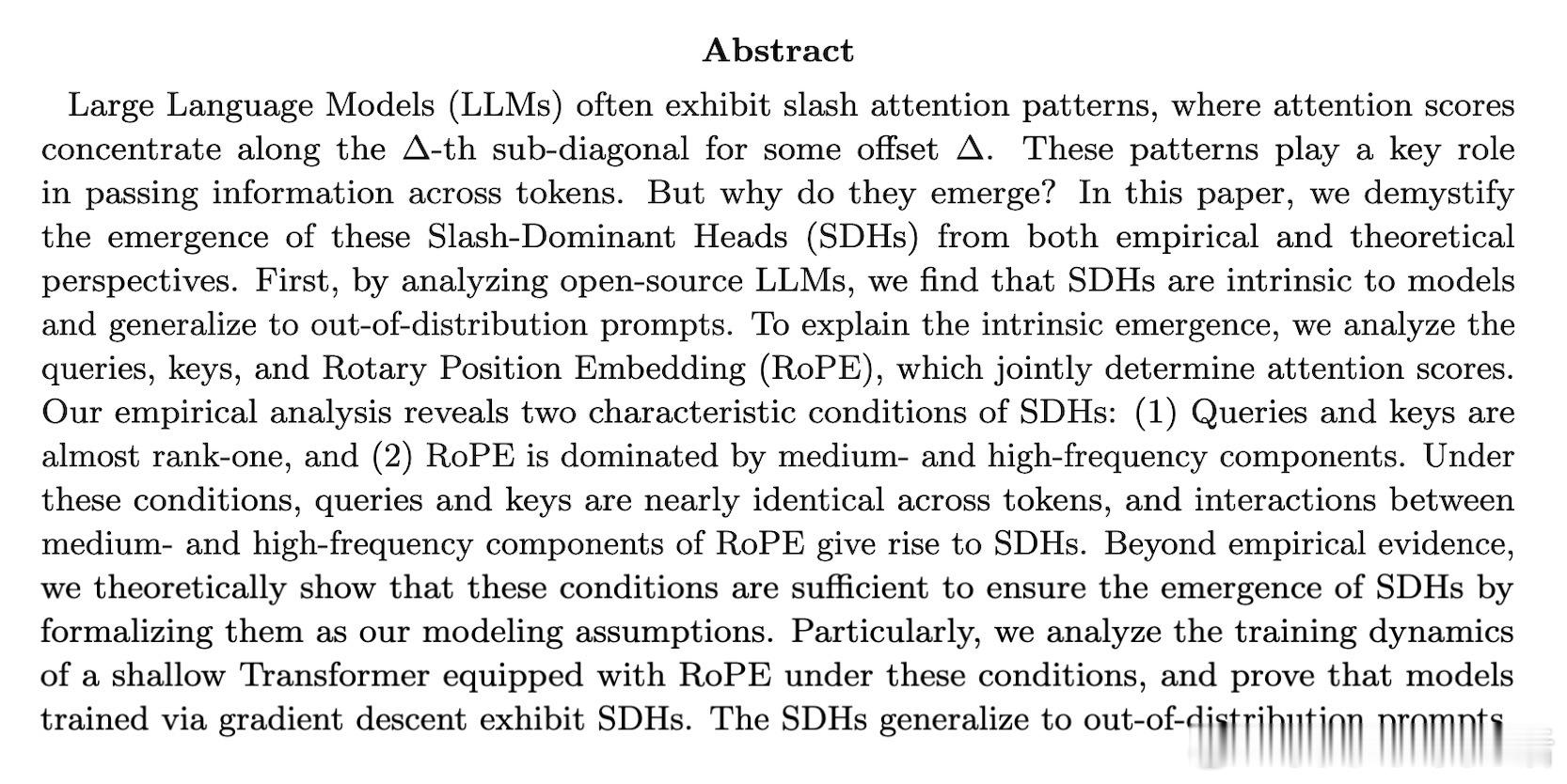 [LG]《Demystifying the Slash Pattern in Attention: The Role of RoPE》Y Cheng, F Zhang, Y Hou, C Du... [National University of Singapore] (2026) 大模型注意力机制中,那些神秘的斜线模式(Slash Pattern)究竟从何而来?当我们观察 Llama 或 Qwen 等大模型的注意力矩阵时,常会发现能量高度集中在某些特定的次对角线上。这种被称为“斜线主导头”(SDH)的现象,不仅是模型传递信息的关键回路,更是理解其内在逻辑的切入点。本文揭开了这一谜团:这并非巧合,而是旋转位置编码(RoPE)与模型几何特征共同演化的必然。1. 斜线模式是模型的“本能”,而非对输入的“反应”研究发现,这些斜线模式是模型固有的算法机制。即便输入完全随机、毫无语义的乱码,这些斜线依然清晰可见。这意味着 SDH 具有极强的分布外(OOD)泛化能力。它不是在处理特定的文本语义,而是在执行一种底层的、通用的信息传递协议。2. 语义的收敛与权力的交接为什么注意力会表现得如此整齐划一?秘密在于 Token 嵌入的几何结构。在主流 LLM 中,Token 向量实际上分布在一个圆锥体(Cone)上。这导致投影后的 Query 和 Key 矩阵在不同 Token 之间几乎是“秩一”(Rank-one)且近乎相同的。当语义信息的差异被刻意压缩,位置信息便接管了战场,主导了注意力的分配。3. RoPE 频率的精密共鸣既然 Query 和 Key 在不同 Token 间几乎失去了区分度,那么注意力的波动就全看 RoPE 的表演了。RoPE 的中高频组件在特定的偏移量下会产生相长干涉,精准地制造出注意力分数的峰值。正是这种频率间的协作,决定了模型在哪个距离上“搬运”信息。4. 梯度下降驱动的数学必然这不只是经验性的观察,更是数学上的必然。研究者通过对浅层 Transformer 的训练动力学分析证实:在梯度下降的作用下,只要满足 Token 圆锥分布和特定的 RoPE 频率条件,模型在训练过程中必然会演化出这种斜线模式。这是模型在优化路径上寻找到的高效信息传递方案。深度启发:语义退场之处,便是结构显现之时。斜线模式的本质,是大模型在极低秩的语义背景下,利用位置编码构建的一套高效索引系统。它告诉我们,模型在处理长文本时,有时并不关心“你说了什么”,而只关心“那个信息在什么位置”。这一发现为模型优化提供了全新视角:既然 SDH 的 Query 和 Key 具有明显的低秩特性,我们完全可以针对性地进行参数压缩,在几乎不损失性能的前提下,大幅提升推理效率。详情参考:arxiv.org/abs/2601.08297