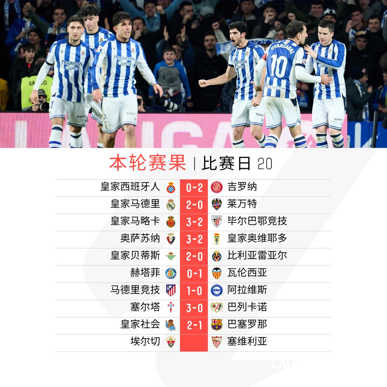 周日完赛 赫塔菲主场不敌@瓦伦西亚足球俱乐部 @马德里竞技俱乐部 一球小胜阿拉维斯 塞尔塔轻取巴列卡诺 皇家社会爆冷战胜@巴塞罗那足球俱乐部 由于本轮失利,积分榜上巴萨仅领先皇马一分