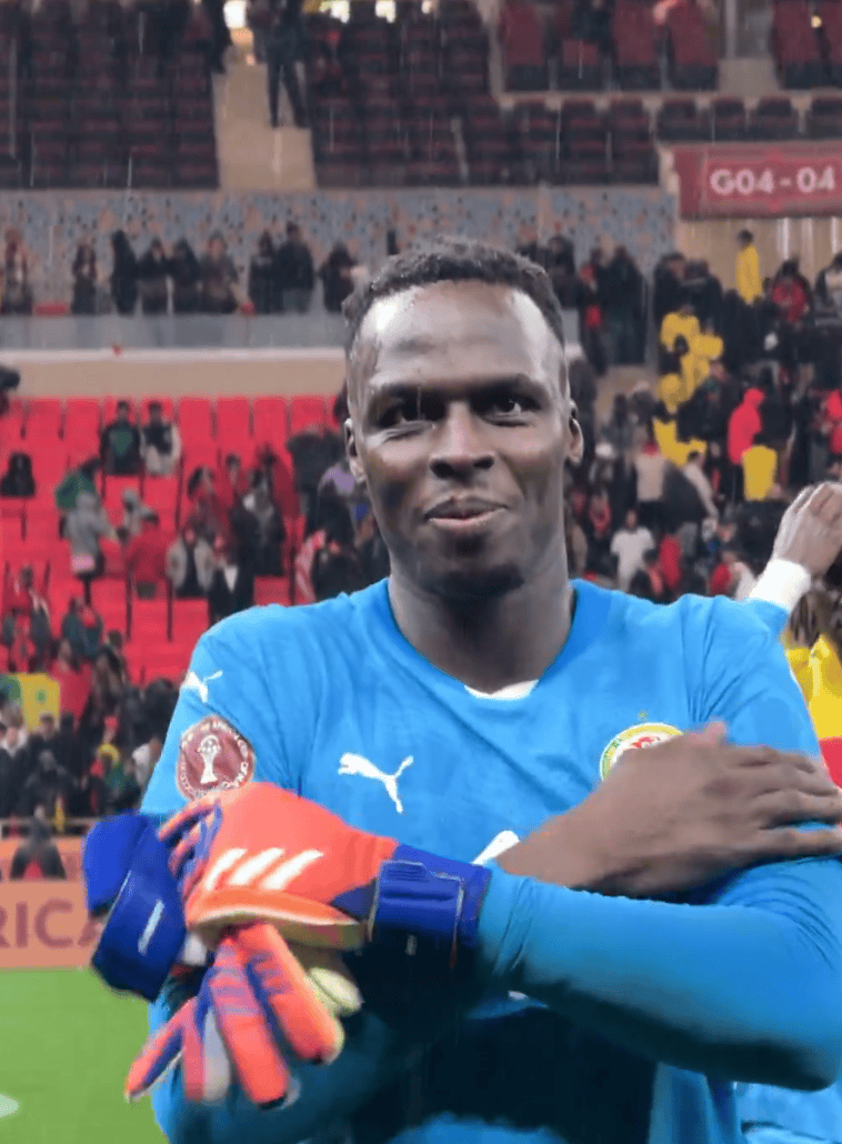 赛后颁奖仪式前,塞内加尔队门将,扑点功臣爱德华-门迪对镜头做出了帕尔默经典的COLD庆祝动作,庆祝胜利。