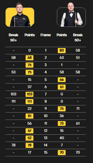 全场比赛,威尔逊打出两杆破百(103、111)和三杆50+(58、53、78),希金斯打出六杆50+(58、51、58、71、61、70)。
