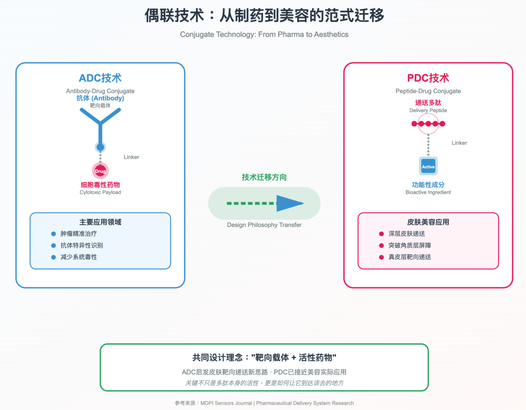 ADC(抗体药物偶联物)虽然主要用于肿瘤治疗,但其“靶向载体+活性药物”的设计理念正在启发皮肤靶向递送的新思路——如果能找到皮肤特异性的靶向分子,就有可能实现比现有方法更精准的递送。