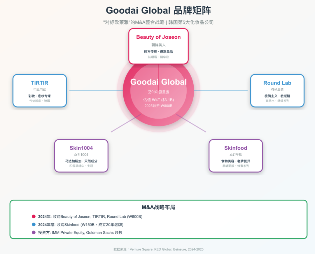 这种增长速度背后是激进的并购策略。Goodai旗下已经聚集了一系列在海外市场爆红的韩国品牌:BeautyofJoseon用现代科研重构韩方成分,精准击中全球"成分党";TIRTIR在色彩彩妆领域占据一席之地;RoundLab的DokdoToner成为爆款产品,其母公司Seorin在2025年被Goodai以约6,000亿韩元收购[10];此外还包括Skin1004、HouseofHur、LakaCosmetics等品牌。公司还在以约1,500亿韩元收购第一代独立品牌Skinfood[11]。