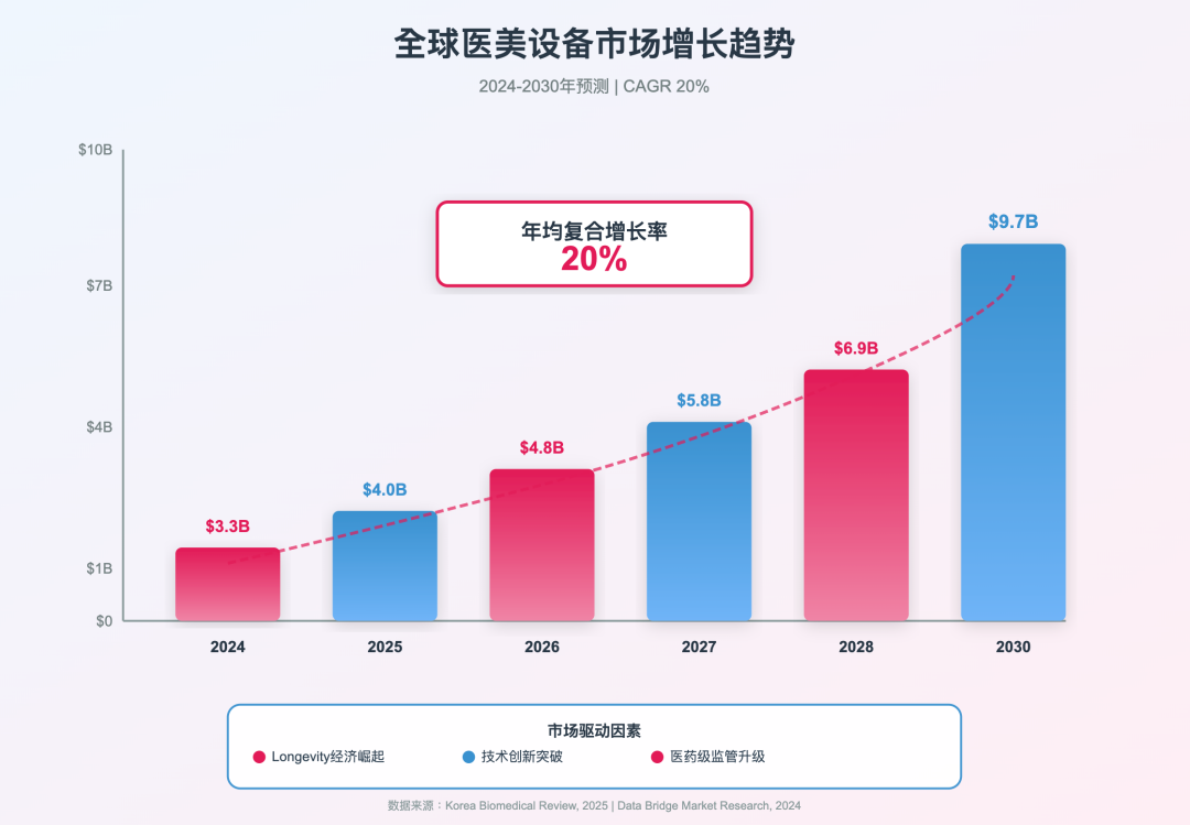 全球医疗美容设备市场正在从2024年的33亿美元快速增长至2030年预计的97亿美元,年均复合增长率(CAGR)达到20%[3]。在亚洲最成熟的市场韩国,这个增速更加惊人:韩国医美市场规模2024年达到27.9亿美元,预计将在2032年达到100亿美元,CAGR为17.3%[4]。