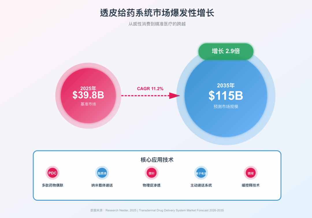 更值得注意的是药物递送端的爆发。透皮给药系统(TransdermalDrugDeliverySystem)市场规模预计从2025年的398亿美元增长至2035年的1,150亿美元,CAGR为11.2%[5]。这个数字的意义在于:它不再是简单的"护肤品市场",而是真正的药物递送技术市场。