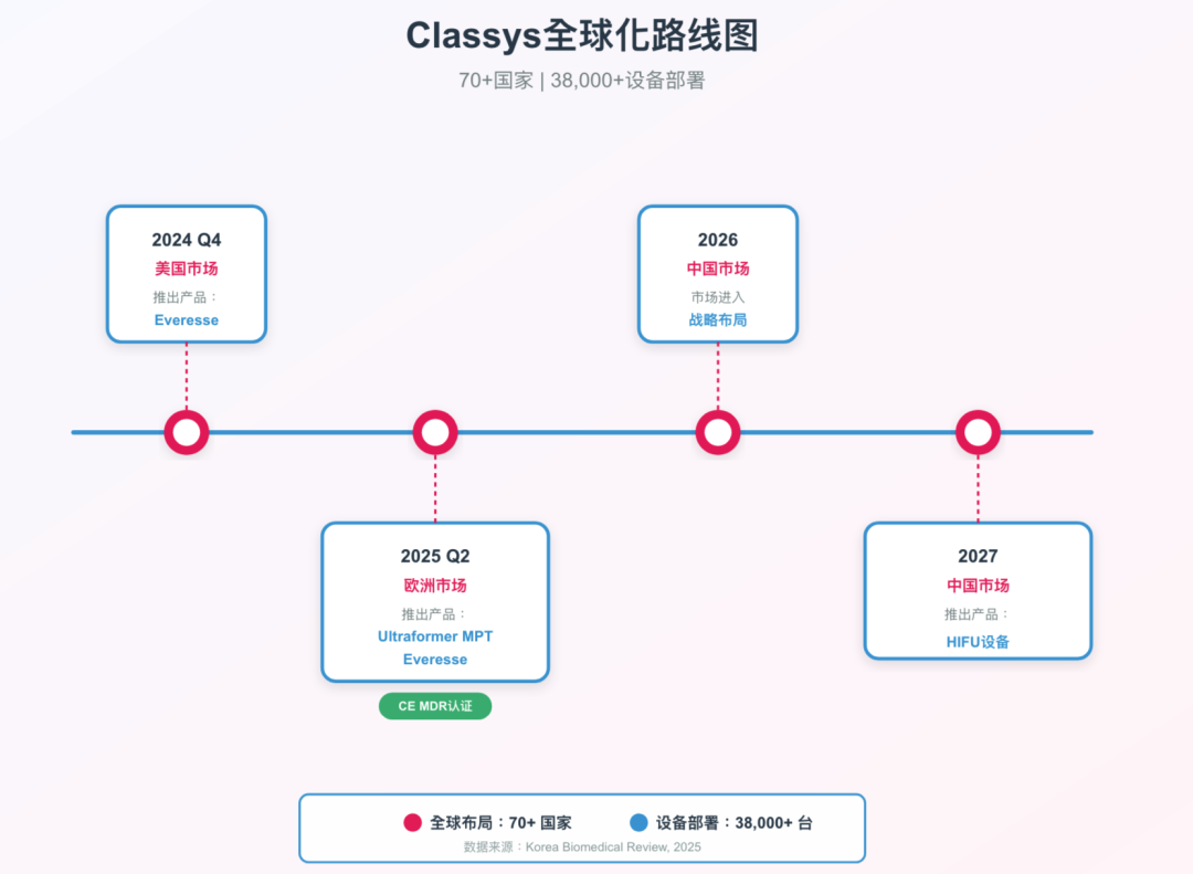 Classys已经在70多个国家部署了超过38,000台设备[3]。其全球化路线图也颇为清晰:2024年第四季度在美国推出Everesse;2025年第二季度计划在欧洲市场推出获得CEMDR认证的UltraformerMPT和Everesse[3];2026年进入中国市场,2027年推出HIFU设备[3]。