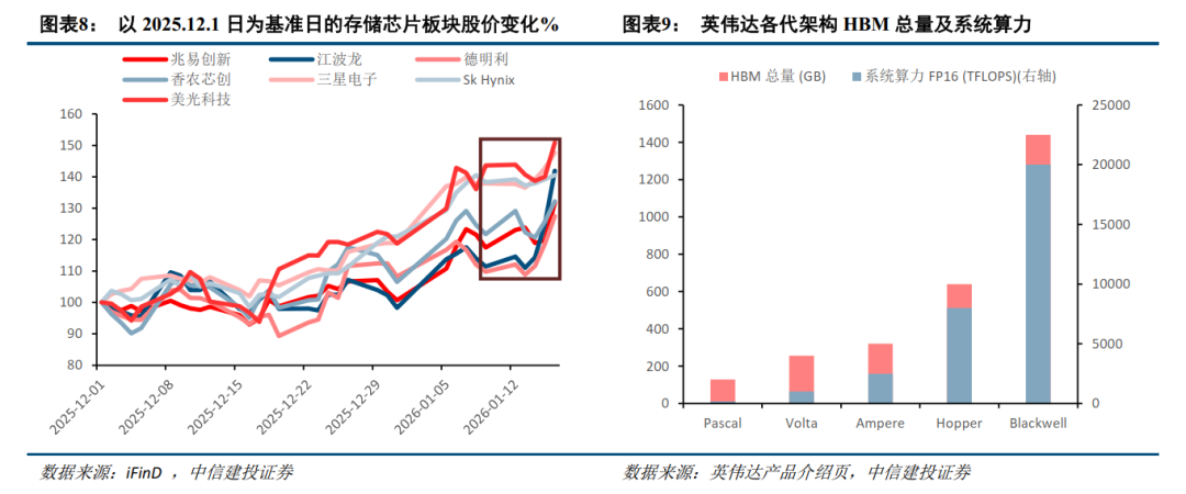 从产业层面观察,随着英伟达GPU架构由Pascal、Volta、Ampere向Hopper、Blackwell演进,单卡HBM搭载容量与系统算力同步大幅提升,存储在AI系统中的配置权重持续上移。尤其在最新一代架构中,HBM容量与算力呈现同步跃升趋势,高端存储已从“配套部件”逐步转变为算力系统性能释放的核心约束之一。这一变化在近期市场定价中开始得到更直接的反映。