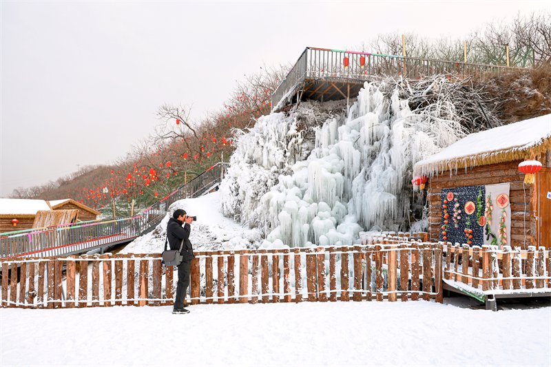 1月17日,游客在邢台抗大·雪韵小镇打卡拍照。