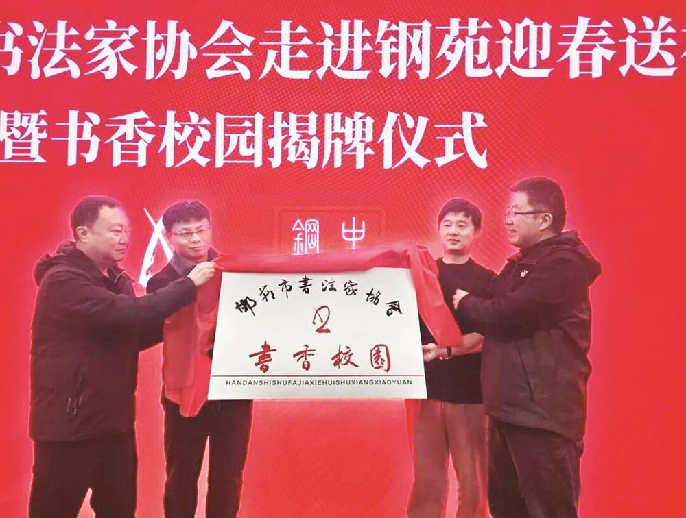 下午4时,“书香校园”揭牌仪式正式开始。王晖校长对各位艺术家的到来表示热烈欢迎,并介绍了出席活动的各位领导与嘉宾。学校党委书记李金泉致词,他说,“钢苑”二字自带刚毅,而书法艺术讲究刚柔并济,当“钢苑”遇上“墨香”,必将碰撞出独特的文化火花。