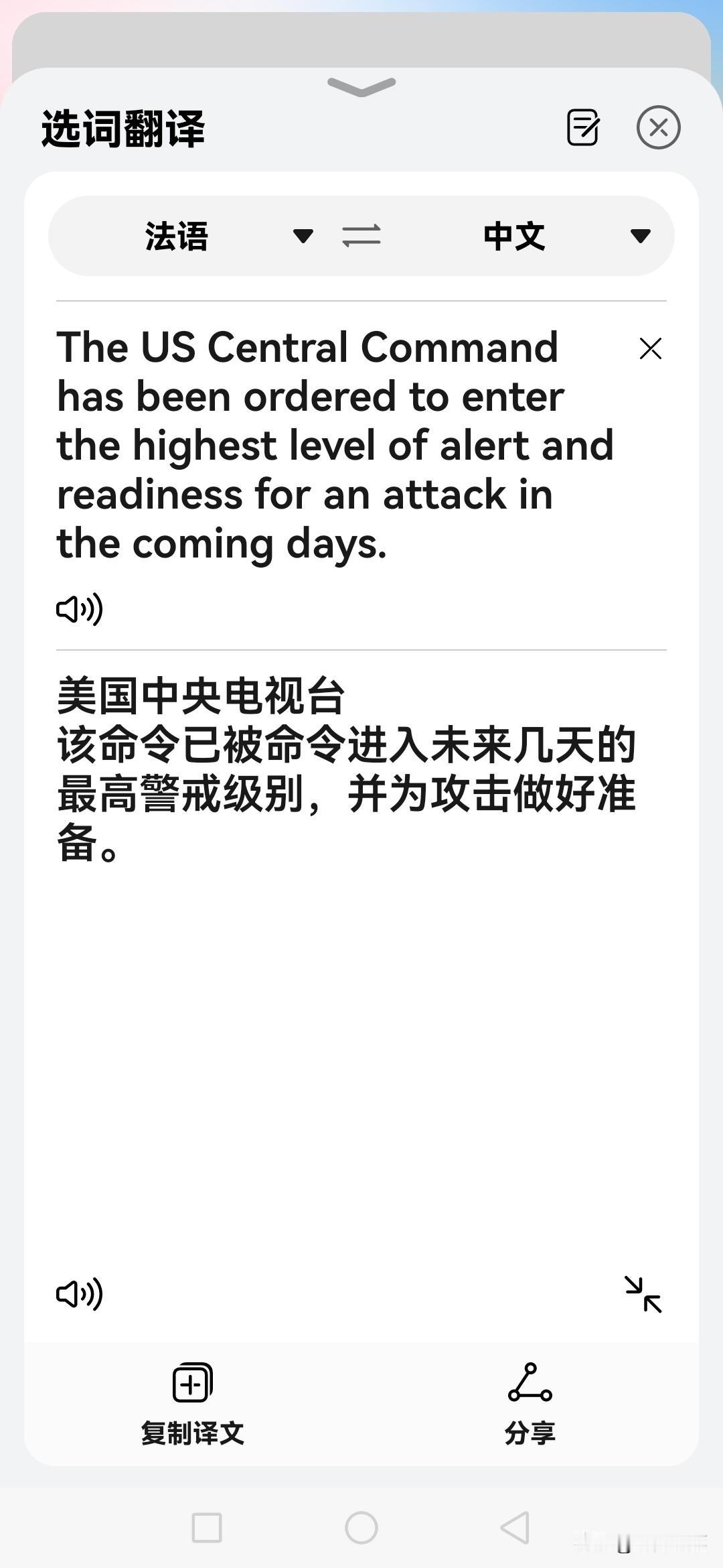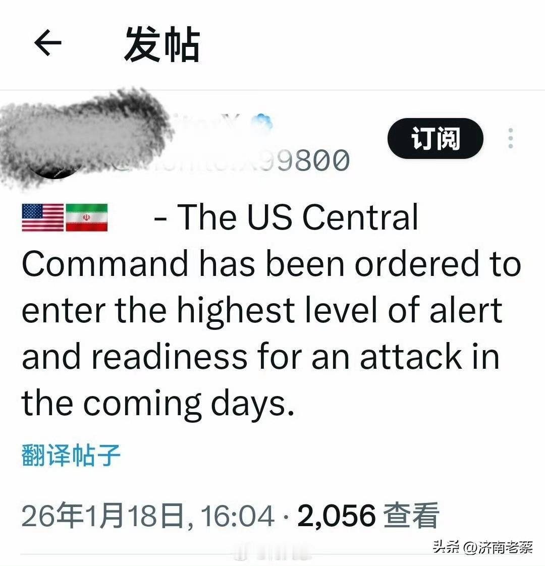 突发新闻: 美国中央司令部已获指令,进入最高等级的警戒与备战状态,为未来几天可能