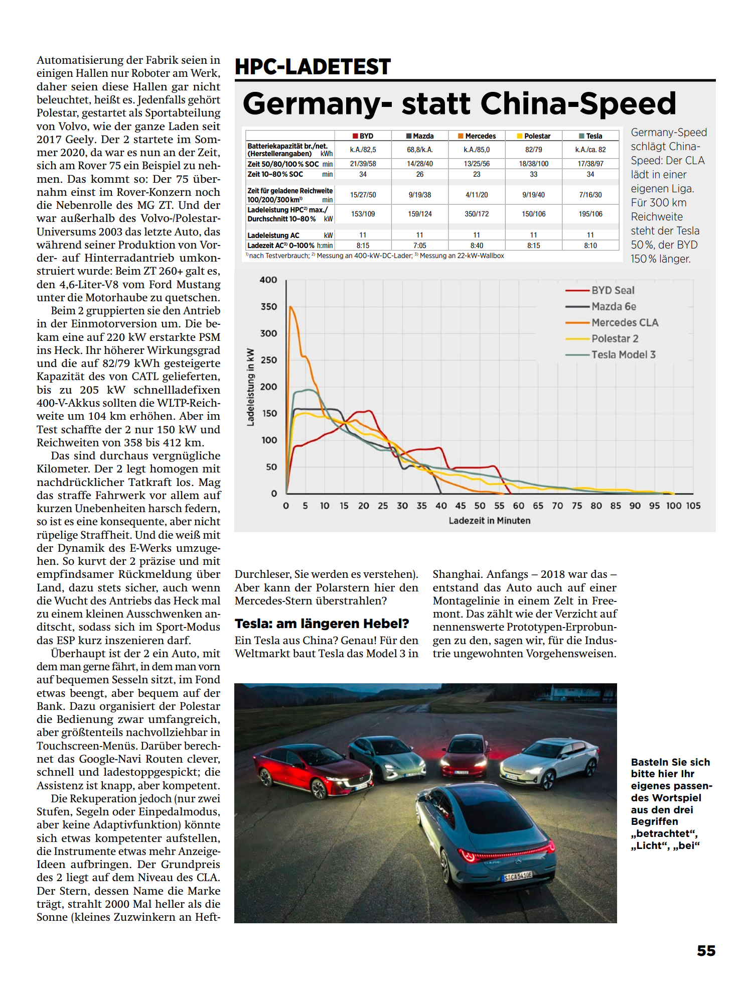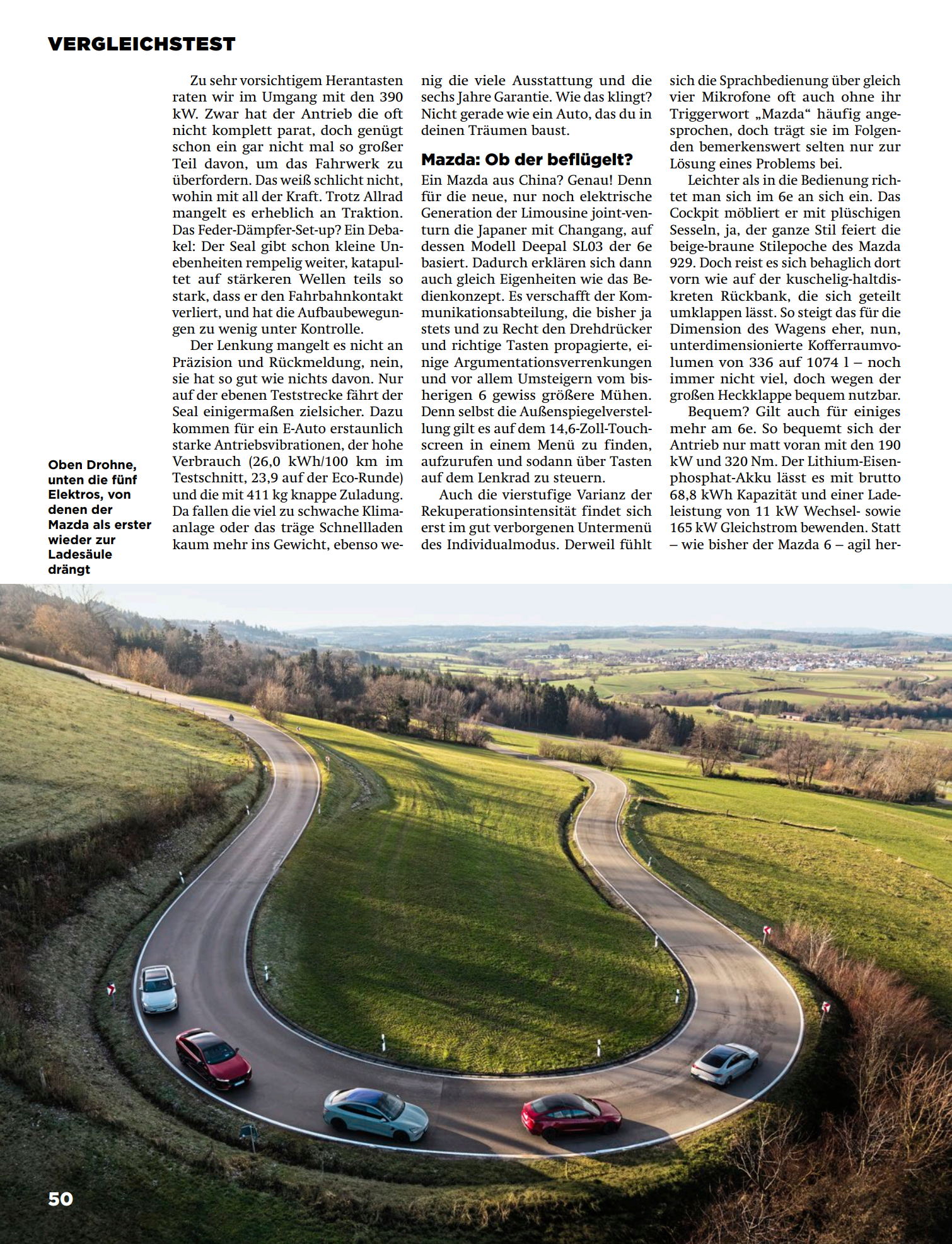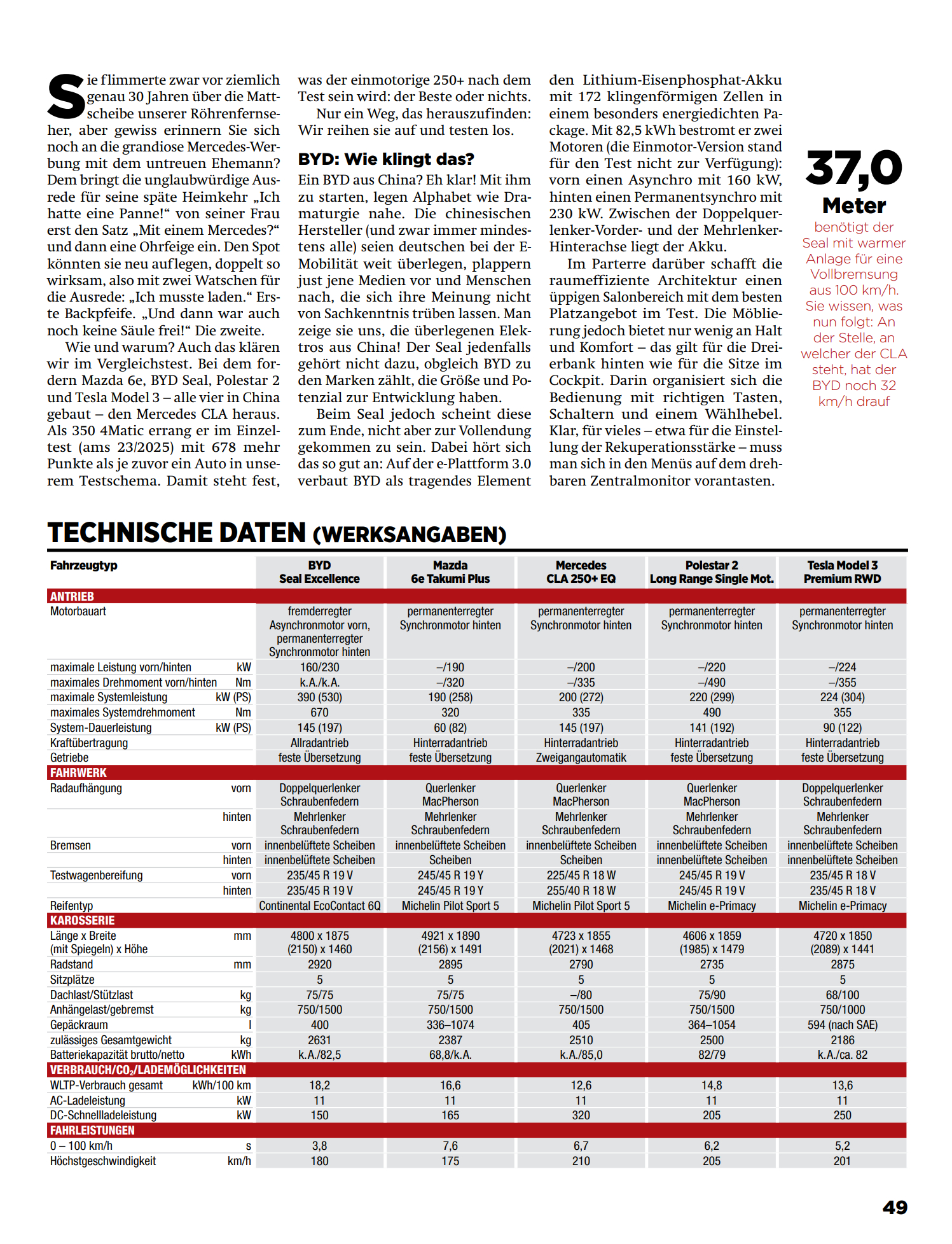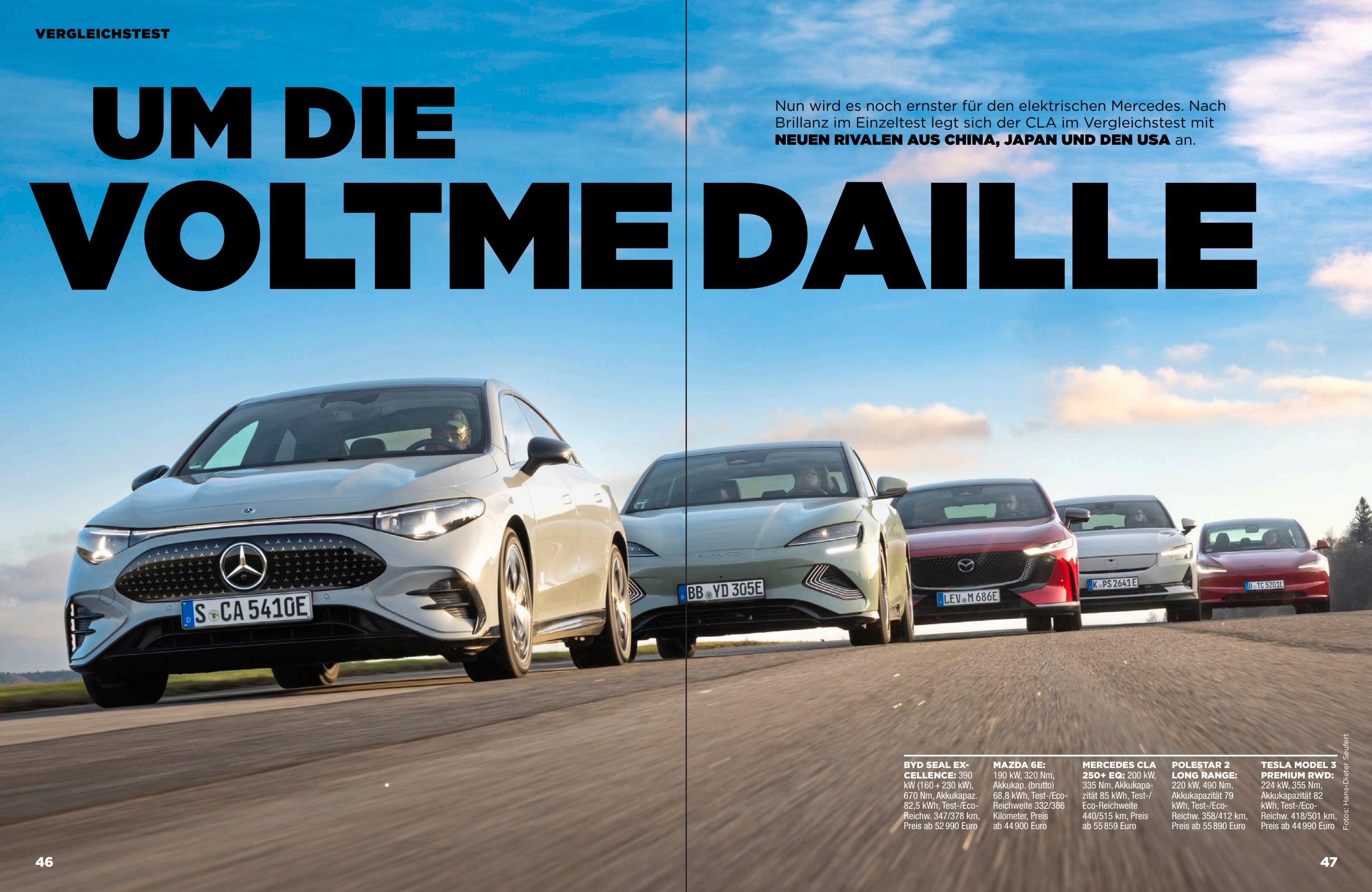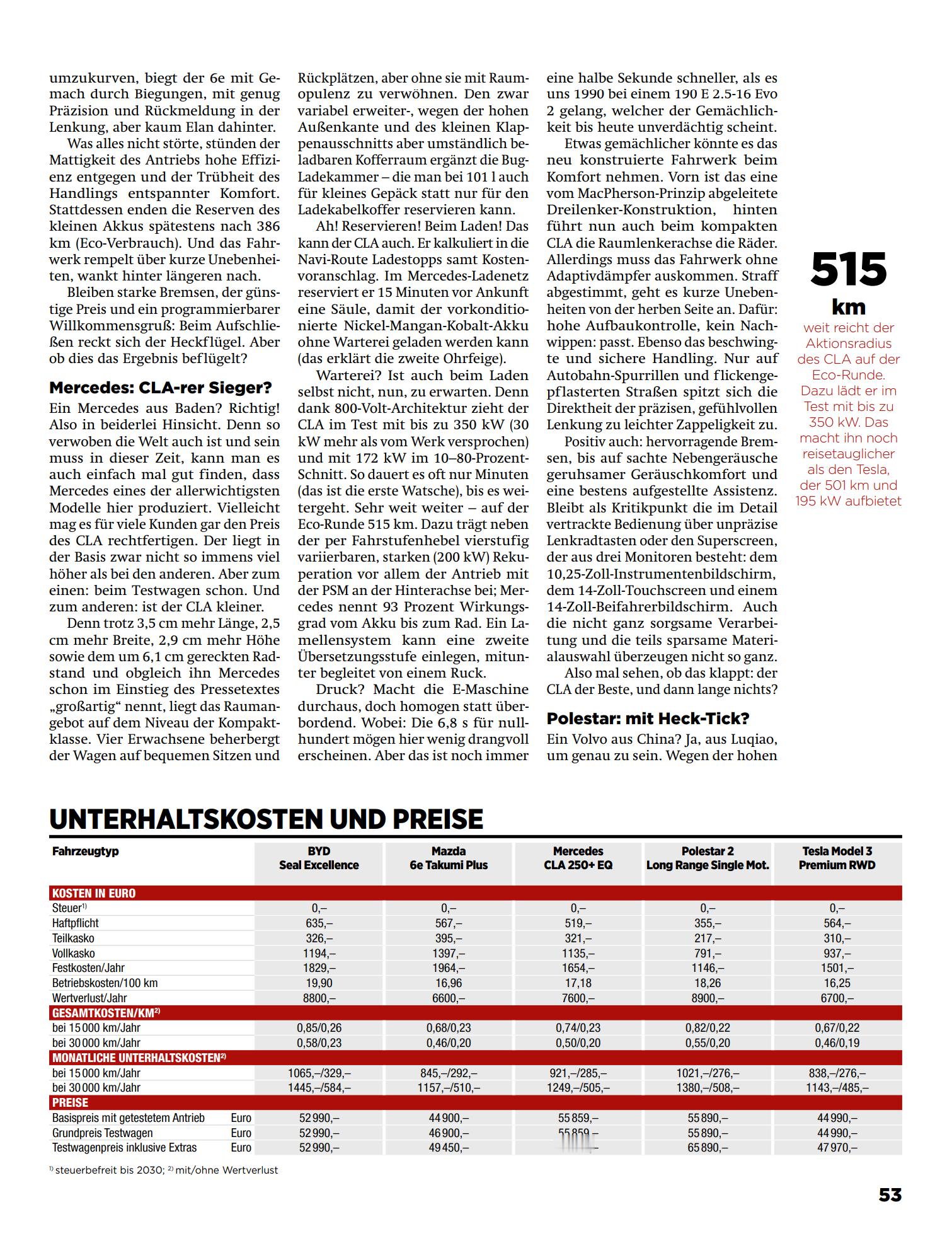 坏消息:华系车垫底,海豹ev和换壳深蓝SL03分列倒数一二。好消息:德国人想找回点场子,只能拿这些三四年前的华系车当绿叶。刷到德国ams杂志的5款纯电轿车大横评,可太有意思了!海豹ev/奔驰CLA纯电/特斯拉Model 3/极星2/马自达ez6,5款车大家都很熟悉,我先点评一下这篇文章,后面会翻译给大家看。德国人对海豹ev是一点不客气,“灾难性的底盘调校” “转向精准度和反馈根本没有” “底盘无法面对任何形式的弯道和颠簸” “只有在平坦的测试路面上才能勉强保持直线行驶”,瞧瞧这像话么。要知道海豹ev的底盘算是笛子最拿得出手的作品了,连徐里里都觉得不错,而且看这次横评的客观数据并不算差。给予如此差评,看来老牌车媒对欧洲那些大儒媒体意见是真的大。谈到刚出的奔驰CLA纯电,自然是给足了面子。优点猛吹,缺点轻描淡写。然后笑点来了,测试车的价格是7.1万欧元,折合人民币57万!!一个紧凑级的两驱纯电轿车,卖特么57万,还硬说物有所值!!欧洲消费者是生活在怎样的水深火热里啊!!这看似是中/美/日/德/瑞5国大混战,其实5款车里面,4款是中国制造,3款是中国平台,可见我国在新能源汽车产业链方面的统治地位。而且海豹ev(2022)、SL03(2022)、极星2(2020)都是老平台老产品,根本没法代表中国车企的优秀水平,看来德国人搞“赢学”也只能找这种绿叶。下面是豆包的翻译总结,可读性大大增加,并省略了无聊的德国笑话。-------------------------------------------------------------------------BYD 海豹 Excellence:潜力未达预期作为中国品牌的代表车型,比亚迪海豹基于 e 平台 3.0 打造,搭载磷酸铁锂电池,采用 172 个刀片电池单元,在空间利用率上表现亮眼 —— 凭借 2920mm 的轴距,提供了测试中最宽敞的乘坐空间,前排头部和后排腿部空间充裕。车内采用传统按键、旋钮与可旋转中控屏的组合设计,操作逻辑清晰,还配备了四孔插座,可满足电动烧烤架、电动车、电吉他等设备的供电需求。但海豹的短板同样突出。其底盘调校堪称灾难:悬挂系统无法应对各类颠簸路面,小起伏会产生生硬的冲击感,较大颠簸时车身弹跳剧烈甚至脱离地面,车身姿态控制极差;即便拥有全时四驱系统,390kW 的动力输出也超出了底盘承受范围,牵引力严重不足。100km/h-0 的热刹车距离长达 37 米。此外,400L 的后备箱容积和 411kg 的载重能力在同级别中处于下游,空调系统制冷效果薄弱,快充效率一般(10%-80% 需 34 分钟),综合测试油耗高达 26kWh/100km,未能展现出中国电动车应有的竞争力。马自达 6e:舒适有余,动力不足这款电动轿车是马自达与长安汽车合作的产物,基于深蓝 SL03 打造,延续了马自达家族的设计基因,车尾的 “鸥翼式” 尾翼在解锁车辆时会自动抬起。车内采用米棕双色的复古内饰风格,座椅填充物柔软,前排和后排乘坐舒适性良好,后备箱容积可从 336L 扩展至 1074L,实用性较强。动力层面,190kW 的电机输出较为温和,7.6 秒的破百成绩缺乏驾驶激情,底盘调校偏向舒适,但面对连续颠簸时车身会出现明显晃动。操作逻辑是其主要槽点:外后视镜调节、四级能量回收强度等功能均隐藏在 14.6 英寸触控屏的深层菜单中,需配合方向盘按键操作,便利性欠佳;语音控制系统虽配备四个麦克风,但识别准确率和实用性不足。续航表现中规中矩,经济模式下续航 386km,直流快充 10%-80% 需 26 分钟,起售价 44,900 欧元是其主要竞争力。奔驰 CLA 250+ EQ:综合实力夺冠这款产自德国拉斯塔特的电动轿车,凭借 800V 高压平台成为测试中的最大赢家。其核心优势集中在续航与补能效率:经济模式下续航高达 515km,直流快充功率峰值可达 350kW,10%-80% 仅需 23 分钟,补充 300km 续航仅需 20 分钟,导航系统还能提前规划充电站点并预留充电桩,彻底解决了电动车的补能焦虑。动力输出线性平顺,200kW 电机配合两挡自动变速箱,93% 的传动效率确保了出色的能效表现,测试能耗仅 21.6kWh/100km。底盘采用前麦弗逊衍生三连杆 + 后多连杆结构,悬挂调校偏硬朗,但车身姿态控制精准,无多余弹跳,转向精准且路感清晰,在蛇形绕桩(67.4km/h)和双移线测试(138.9km/h)中表现最佳。安全配置全面,刹车距离仅 33.1 米(热态),驾驶辅助系统响应迅速,车内静谧性良好(130km/h 时噪音 67dB (A))。不足之处在于内饰材质略显廉价,细节做工有待提升, 三联屏系统的操作逻辑复杂,后排头部空间受溜背造型影响稍显局促,测试车选装后价格高达 71,182 欧元。极星 2 长续航版:操控尚可,续航一般作为沃尔沃旗下的高性能品牌,极星 2 产自中国路桥工厂,2023 年完成改款后将驱动形式从前驱改为后驱,220kW 电机带来了 6.2 秒的破百成绩,动力输出强劲且线性。底盘调校偏向运动,悬挂支撑充足,过弯姿态稳定,转向精准度高,但面对短波颠簸时过滤效果欠佳,舒适性一般。车内采用极简设计风格,材质高档,配备可升降的空调出风口和全景天窗,空间表现中规中矩,前排乘坐舒适,后排腿部空间略紧凑。搭载谷歌车机系统,导航功能强大,能智能规划充电路线,但能量回收仅提供两挡调节和单踏板模式,缺乏自适应功能。续航表现不尽如人意,经济续航 412km,直流快充 10%-80% 需 33 分钟,起售价 55,890 欧元,保值率和售后网络是其潜在短板。特斯拉 Model 3 后驱高性能版:进步明显,仍有遗憾2023 年改款后的 Model 3 在底盘调校上有了显著提升,悬挂舒适性大幅改善,接近奔驰 CLA 的水平,过弯时车身稳定性良好,5.2 秒的破