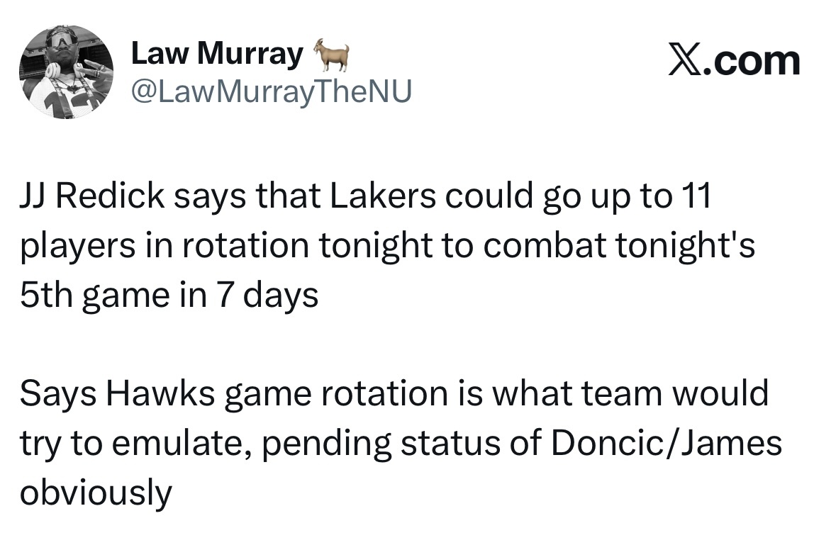 雷迪克表示,湖人今晚可能会将轮换阵容扩大到11人,以应对7天内的第5场比赛。他还提到,球队会尝试复刻对阵老鹰一战的轮换模式,当然这还要取决于东契奇和詹姆斯的出战状态。